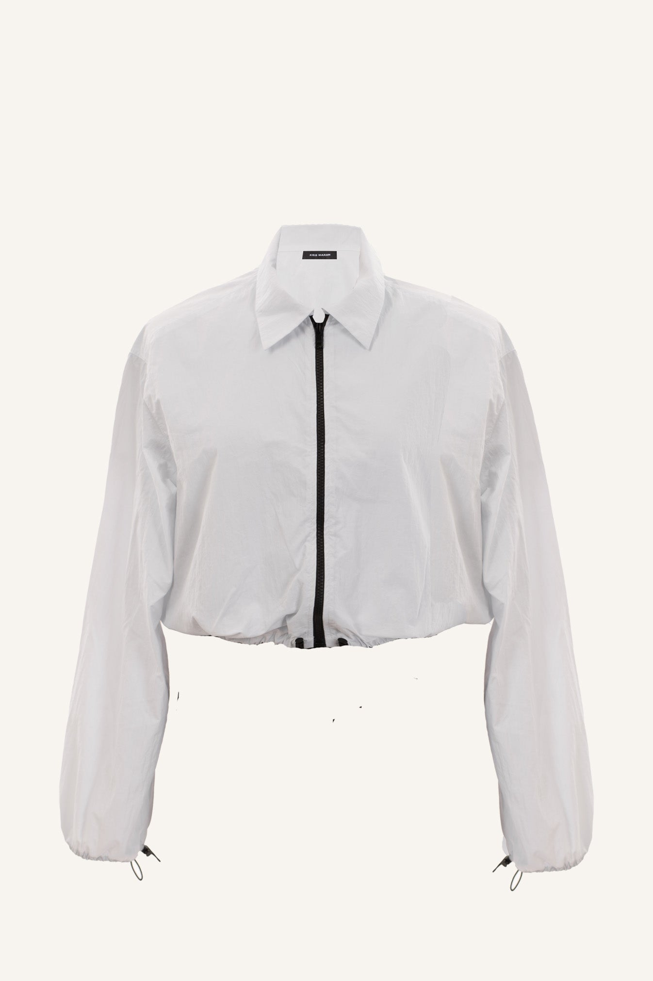 Укорочений бомбер оверсайз із коміром, чорним контрастним замком, регуляторами та резинками у нижній частині бомбера та рукавах.
