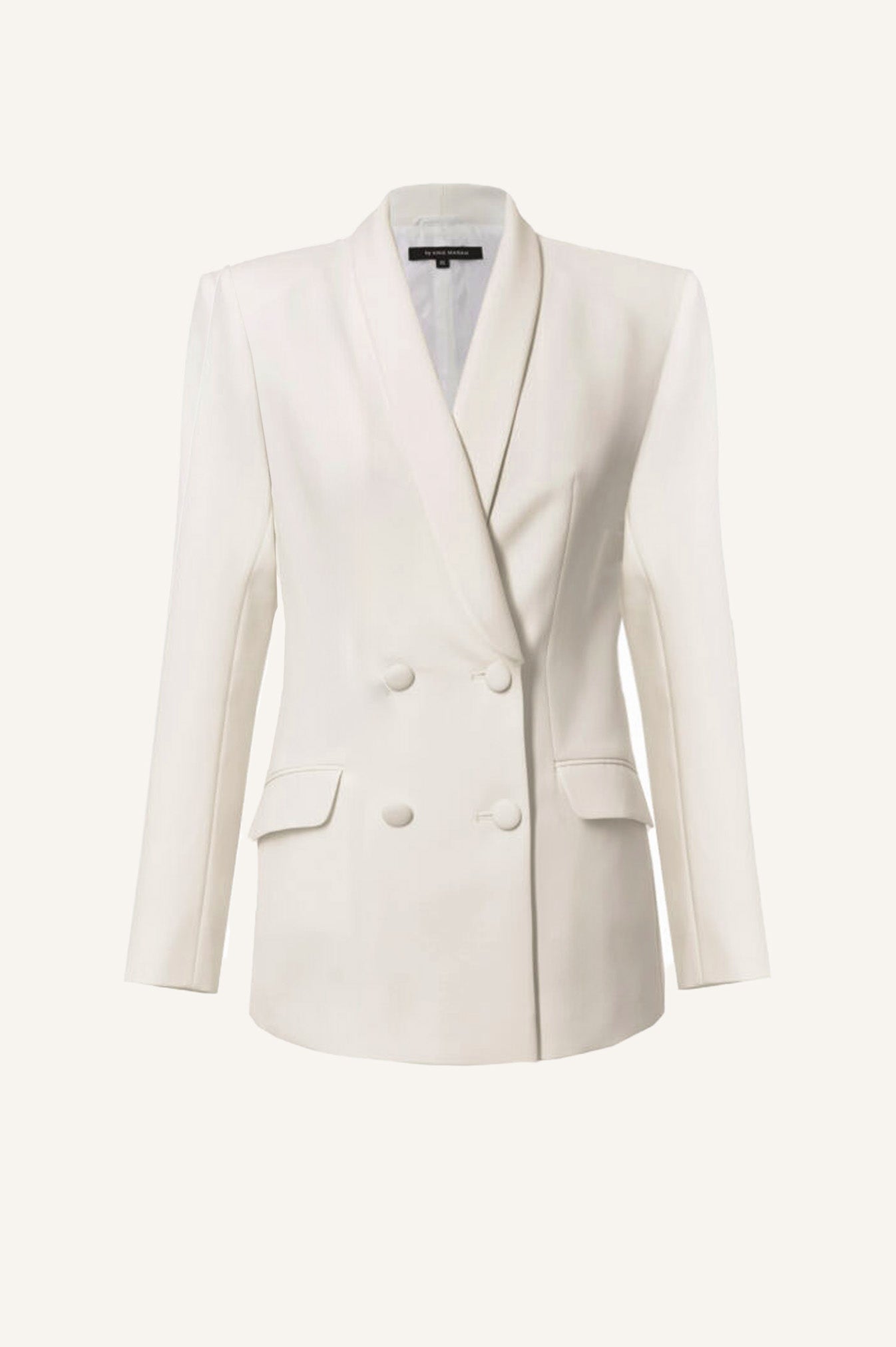 Піджак напів приталеного силуету з шовковим коміром стійкою та шлицею. Двобортна застібка на ґудзиках.