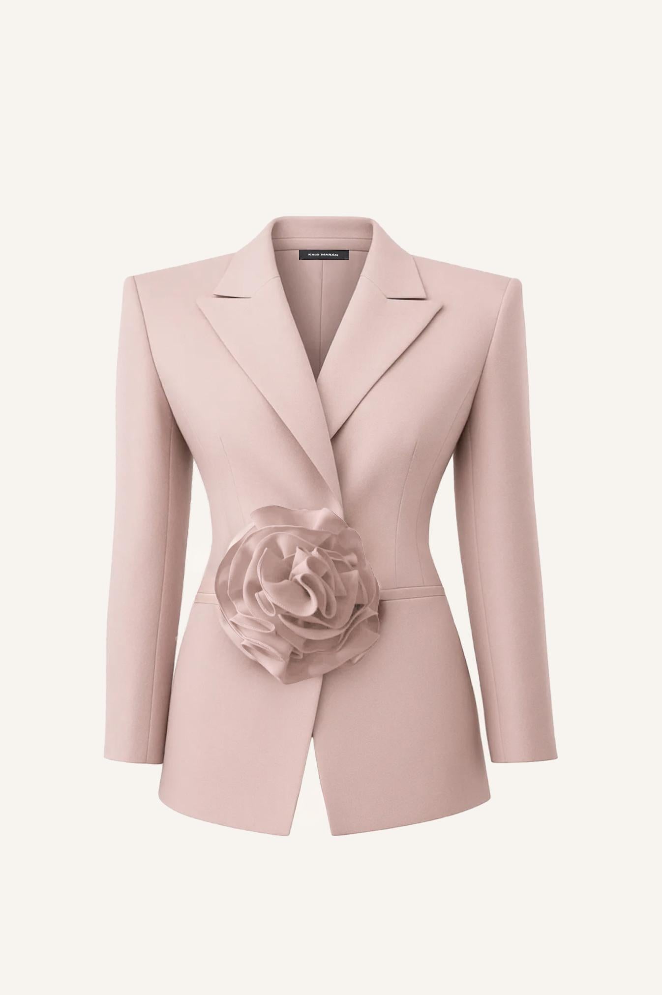 Блейзер приталеного силуету з напів розширеним плечем та трояндою ручної роботи на застібці.