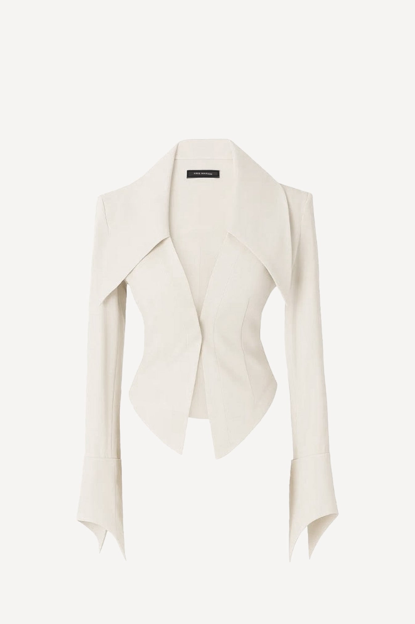 Сорочка приталеного силуету з коміром оверсайз, розрізами на манжетах та золотими знаковими ґудзиками у формі логотипу бренду.
