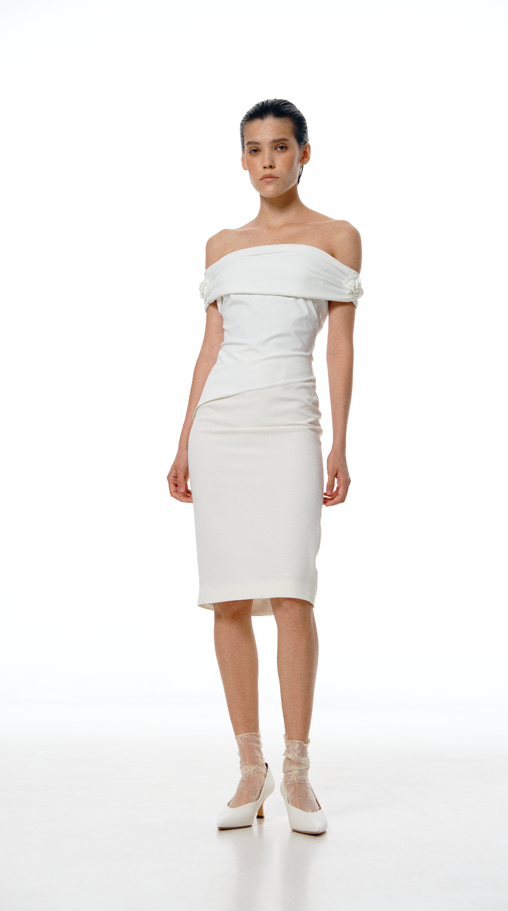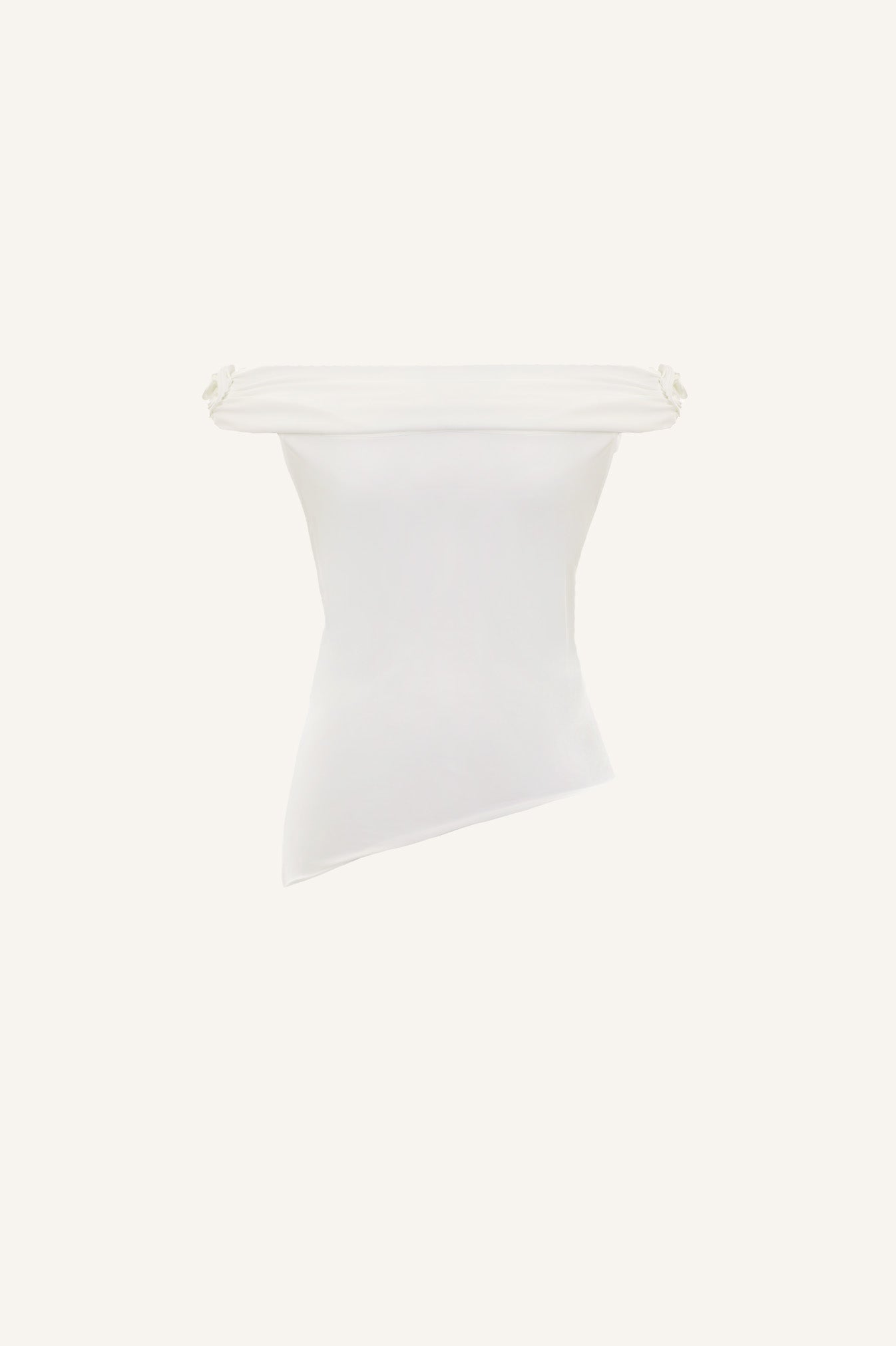 Силуетний білий топ з оголеними плечима та квітами ручної роботи.