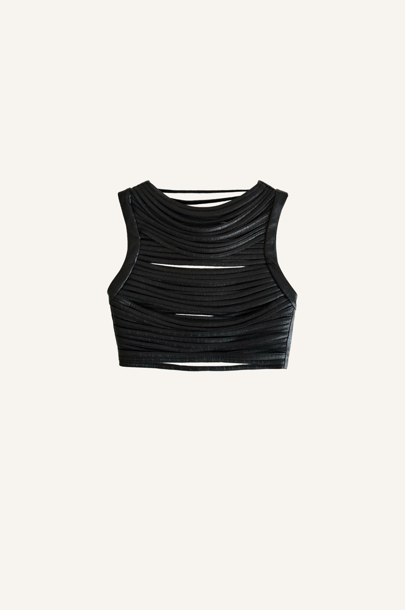 Топ ручної роботи з шкіри Vegan, натхненний природною текстурою рептилій. Скульптурний крій і вишукане ручне плетіння створюють ефектний, вишуканий силует.