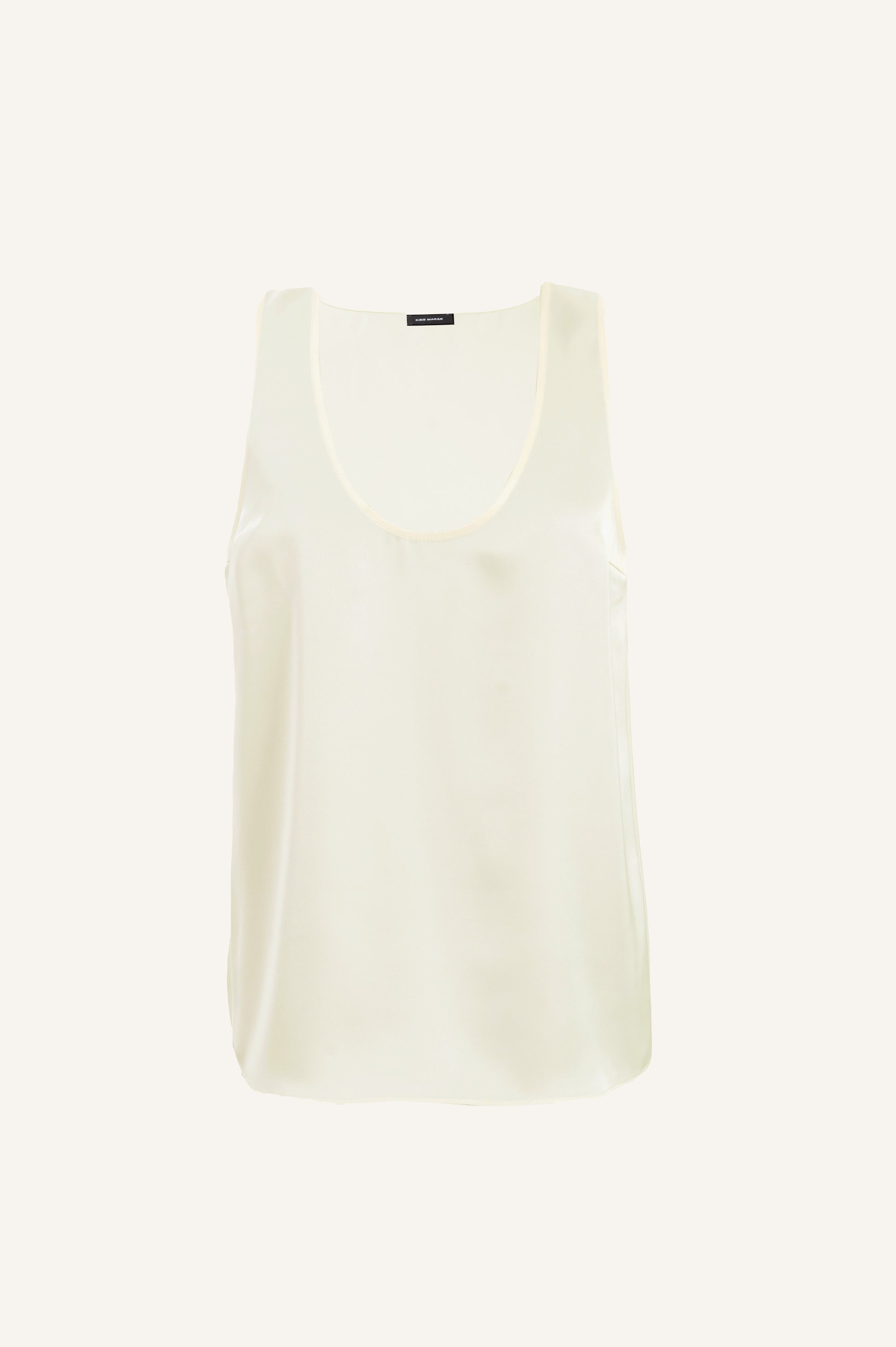 Легкий шовковий топ з глибоким округлим вирізом — уособлення елегантної простоти. Його вільний силует забезпечує комфорт і свободу рухів. Цей топ — універсальна база для денних і вечірніх образів: носіть його під піджак, з улюбленими джинсами або як делікатний акцент під прозору блузу.