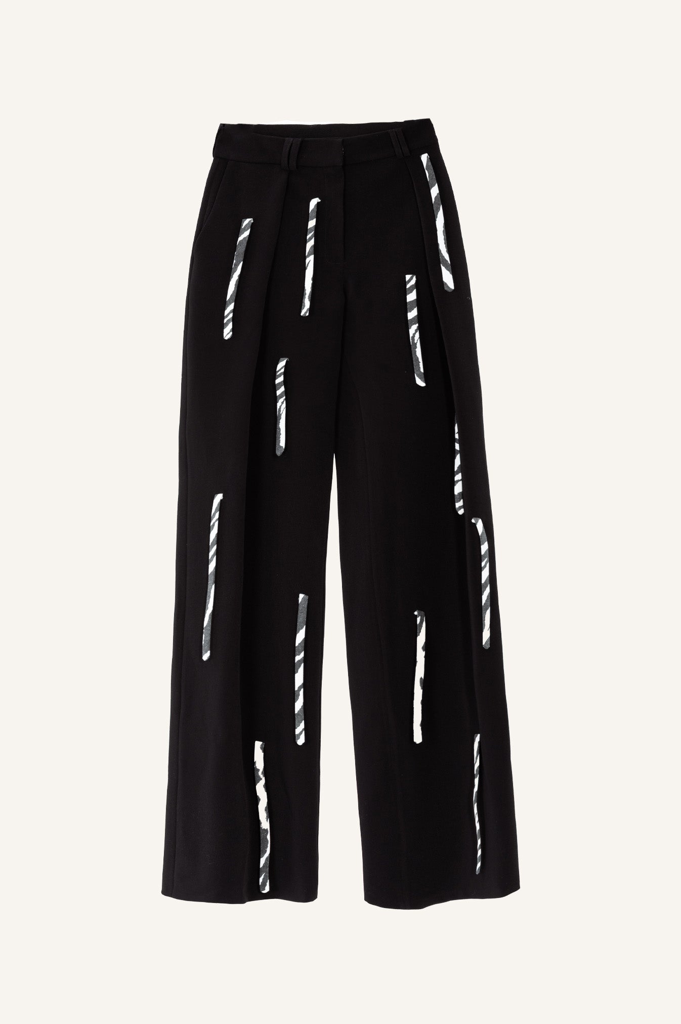 Прямі штани з легкими складками по талії, вільним кроєм та ремінцями з зебровим принтом.