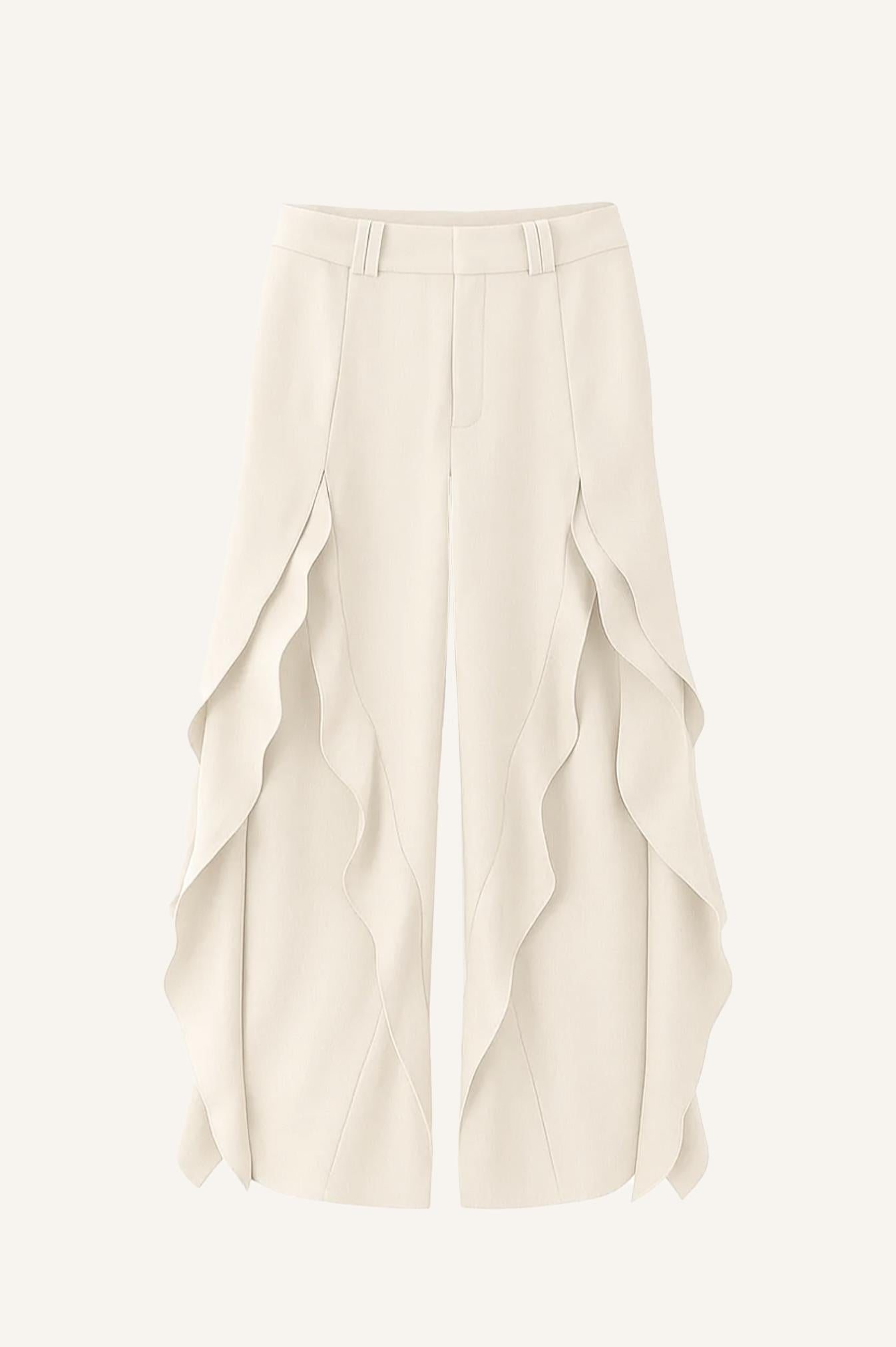 Багатошарові штани у формі пелюсток з глибокими розрізами, які оголюють передню частину ноги.