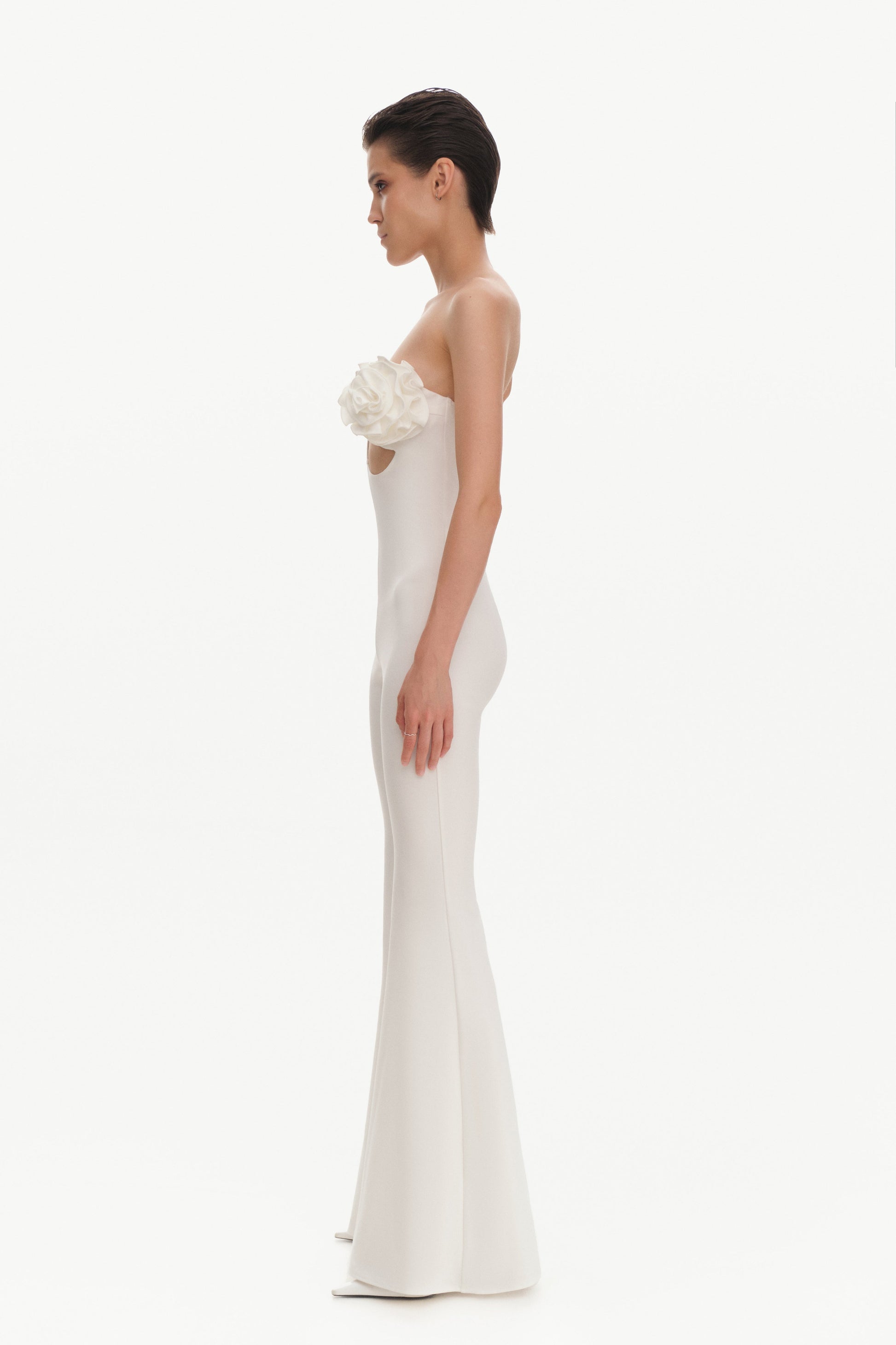 Силуетний асиметричний комбінезон з брюками-кльош та квітковою аплікацією ручної роботи.