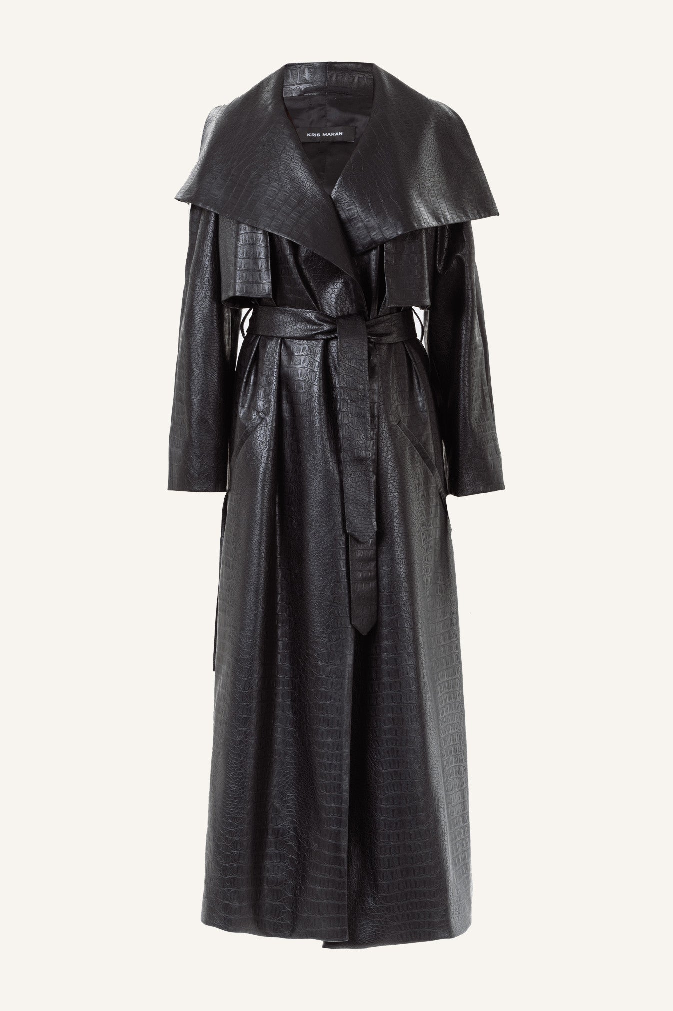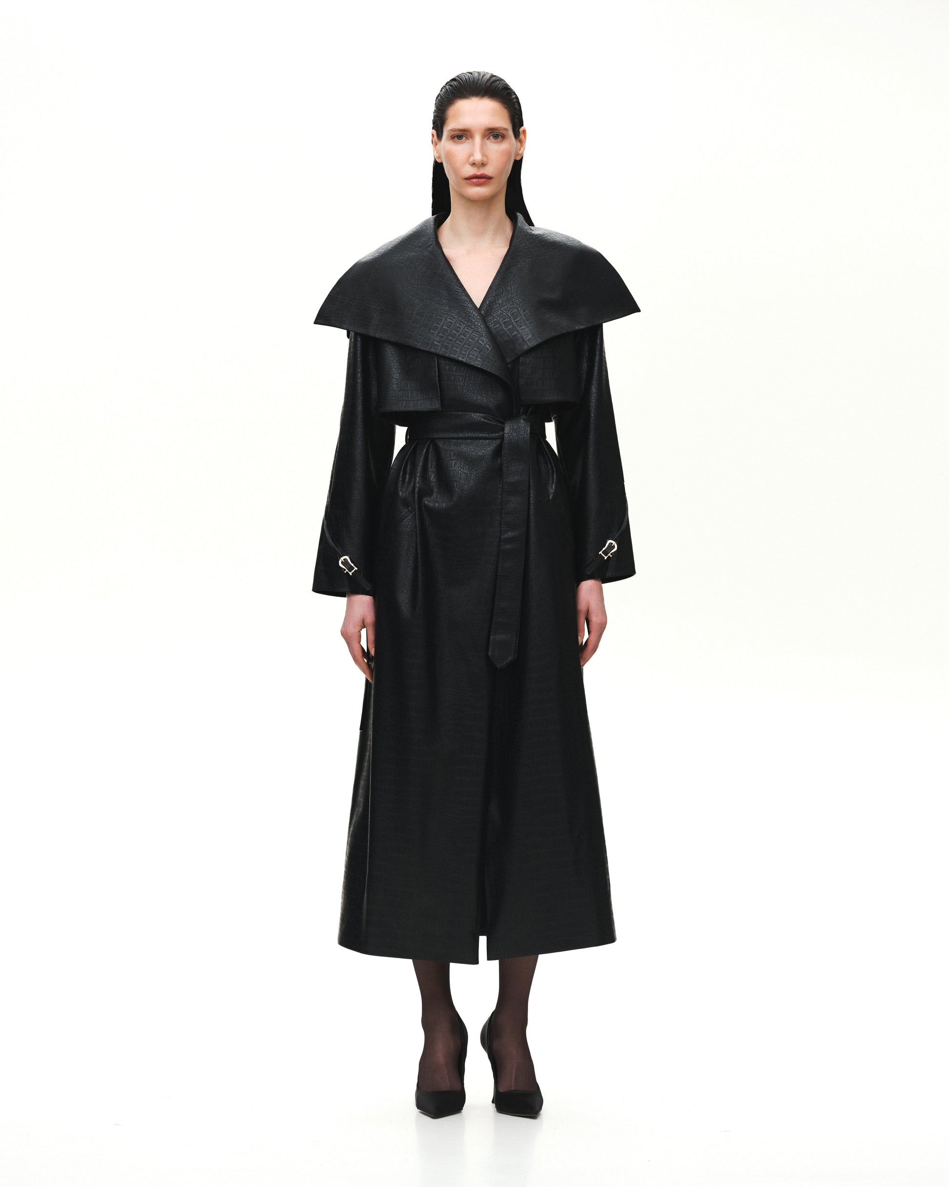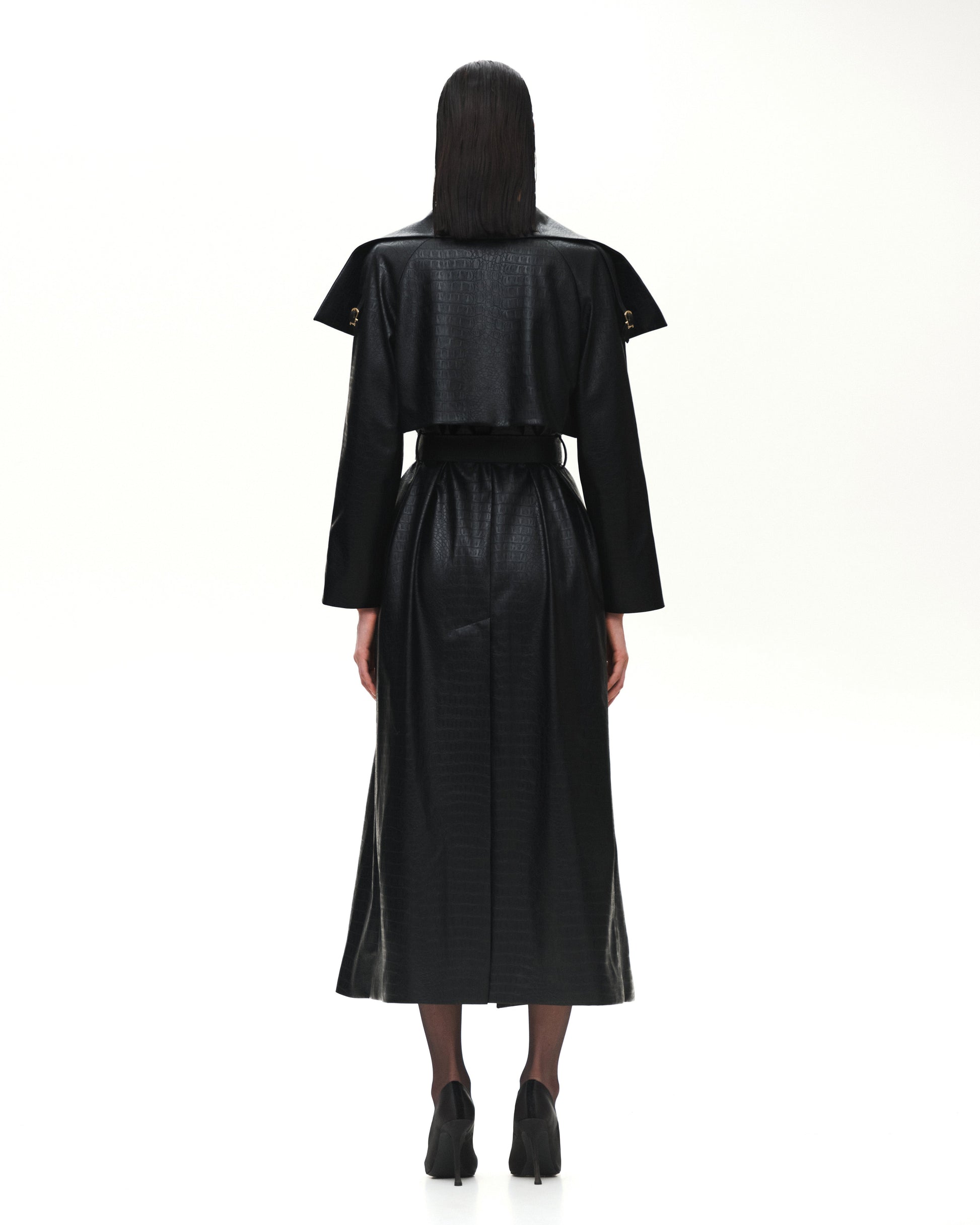 Пальто-тренч у довжині максі з шкіри Vegan з тисненням Reptilia, декоративними золотими пряжками, широким коміром-стійкою, передньою та задньою кокетками, поясом та подвійними бортами.