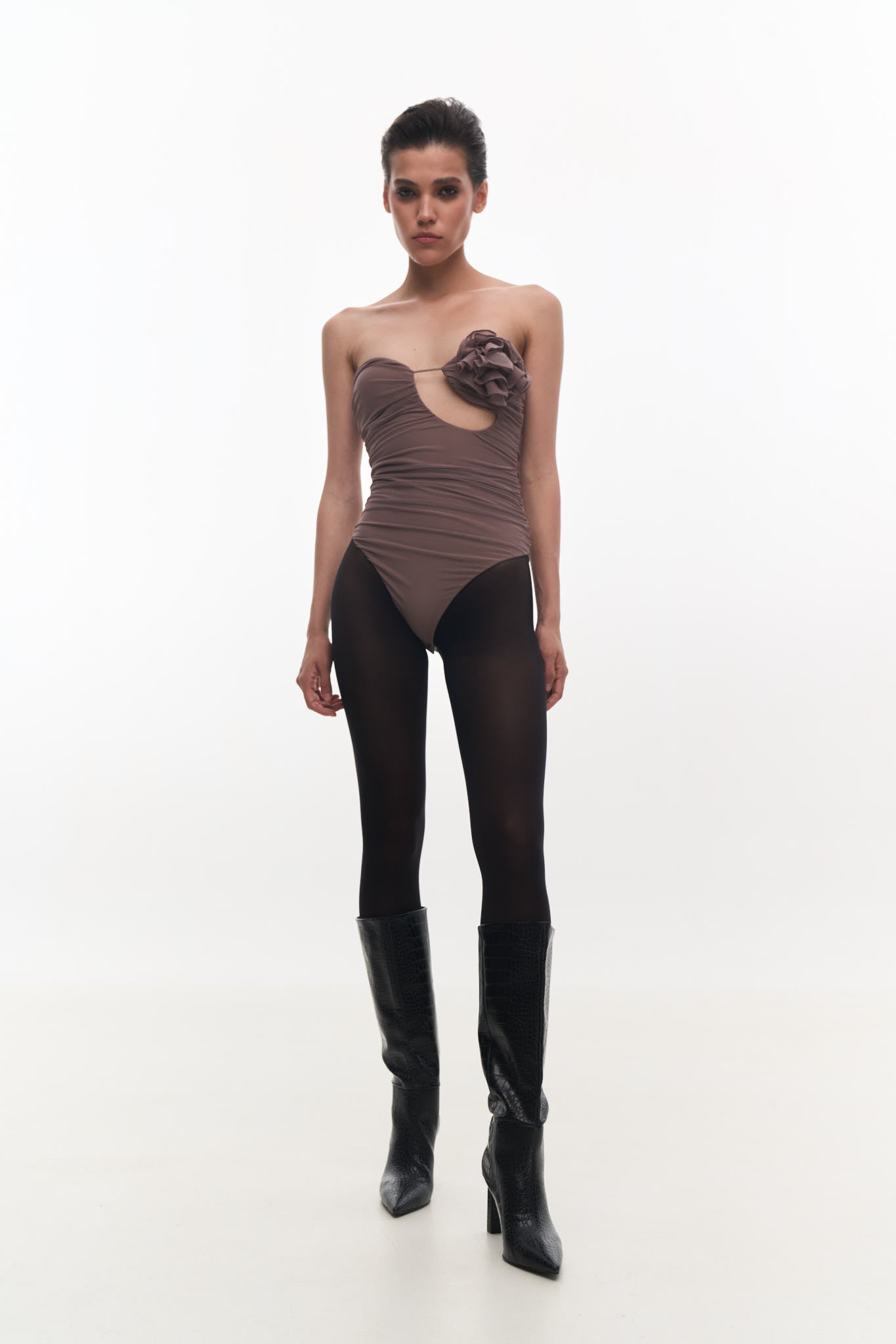Драпіроване боді бюст'є з асиметричним вирізом спереду та квіткою ручної роботи. Бічна прихована застібка на блискавку та застібка на кнопках в нижній частині боді.