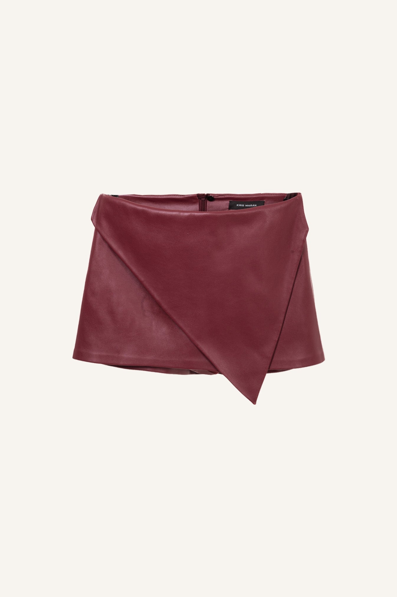 Скорт у довжині міні з шкіри Vegan у кольорі бургунді з знаковим трикутником.