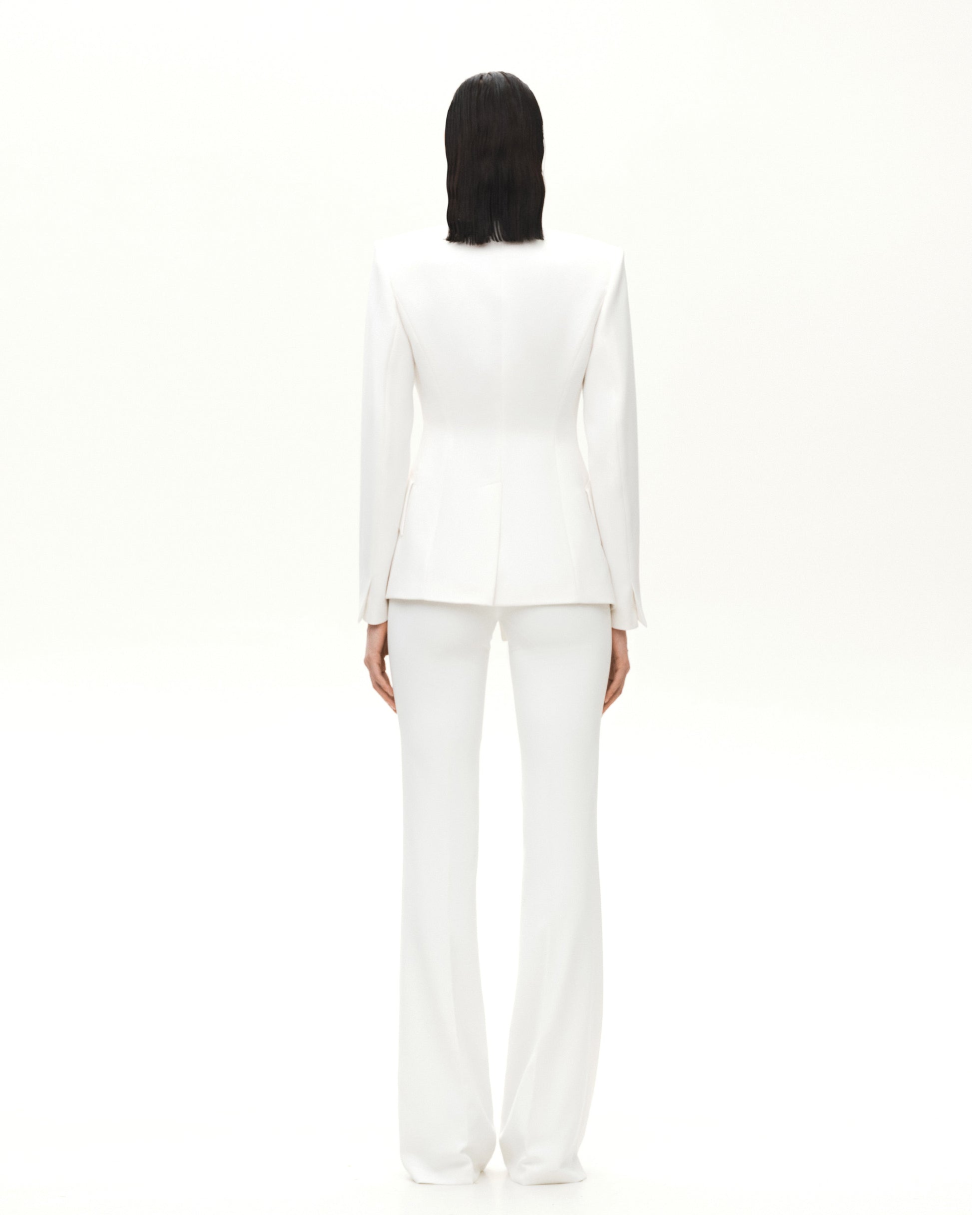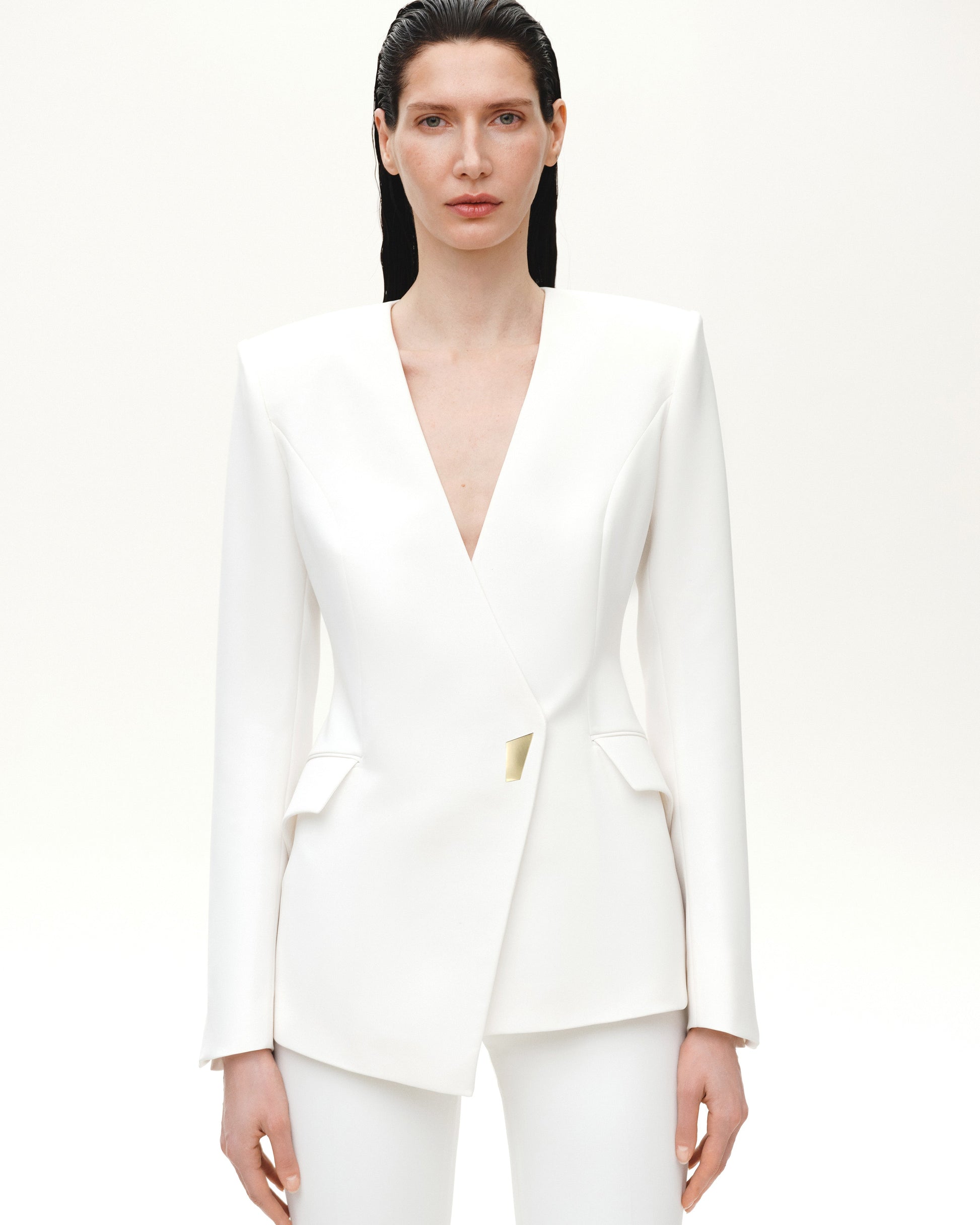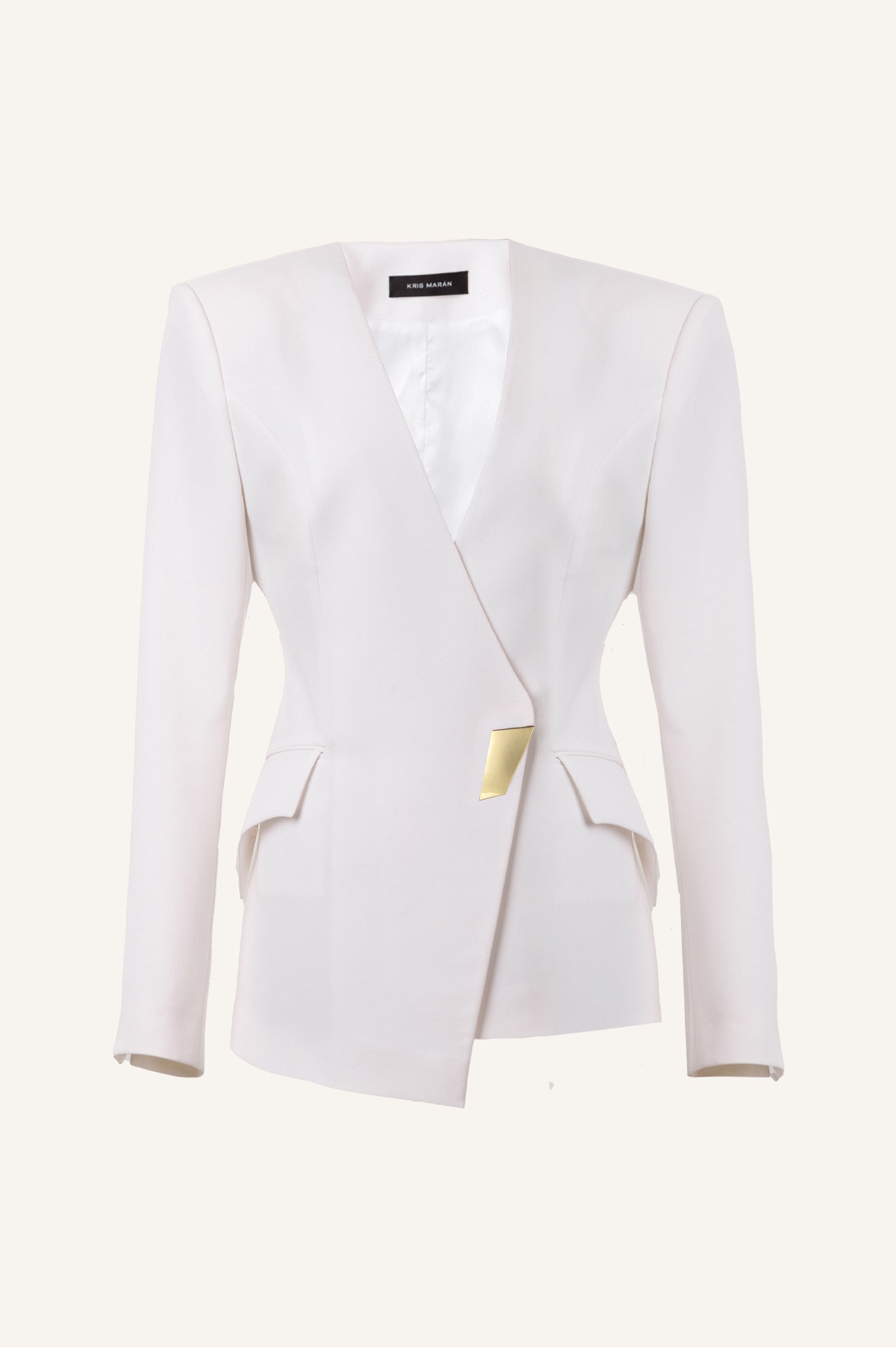 Піджак приталеного силуету з асиметричними бортами, кишенями-клапанами, V-подібним вирізом та знаковим золотим ґудзиком у формі логотипу бренду.