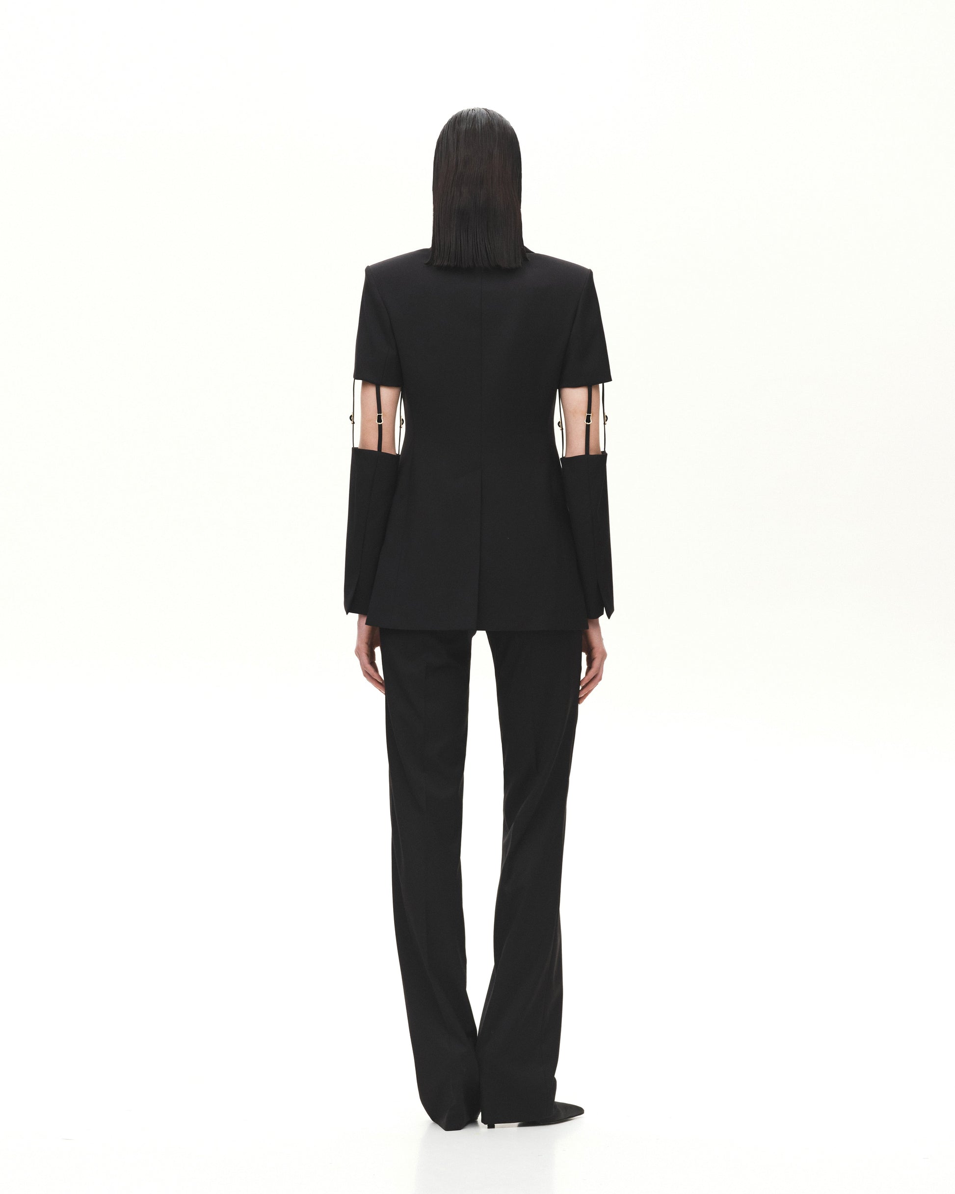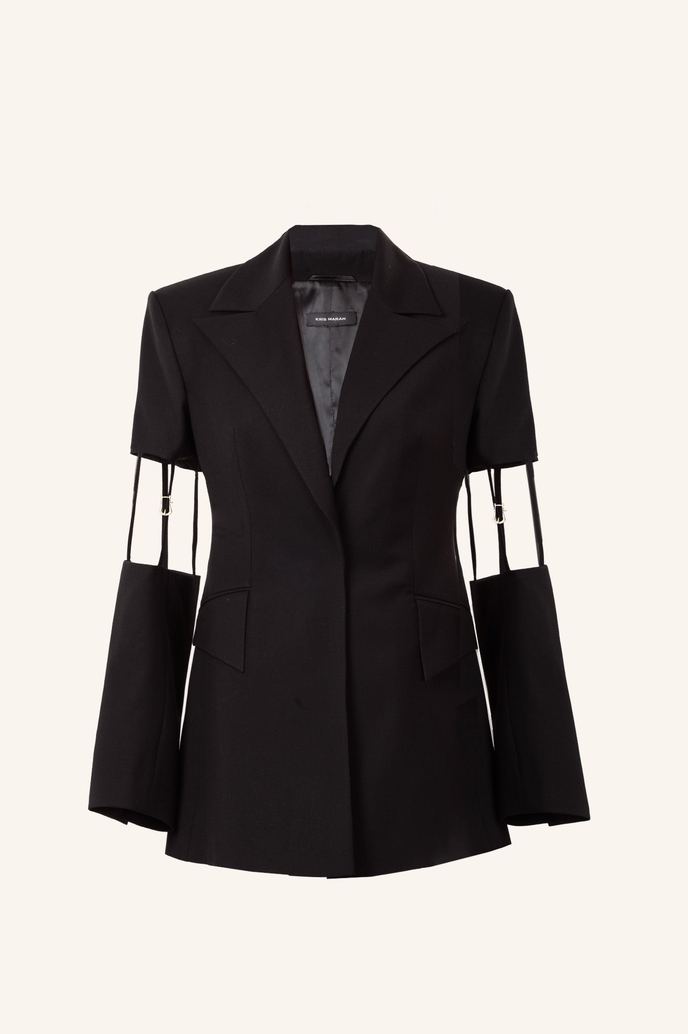 Піджак приталеного силуету з прорізами на рукавах, декоративними деталями-підтяжками та золотими пряжками.