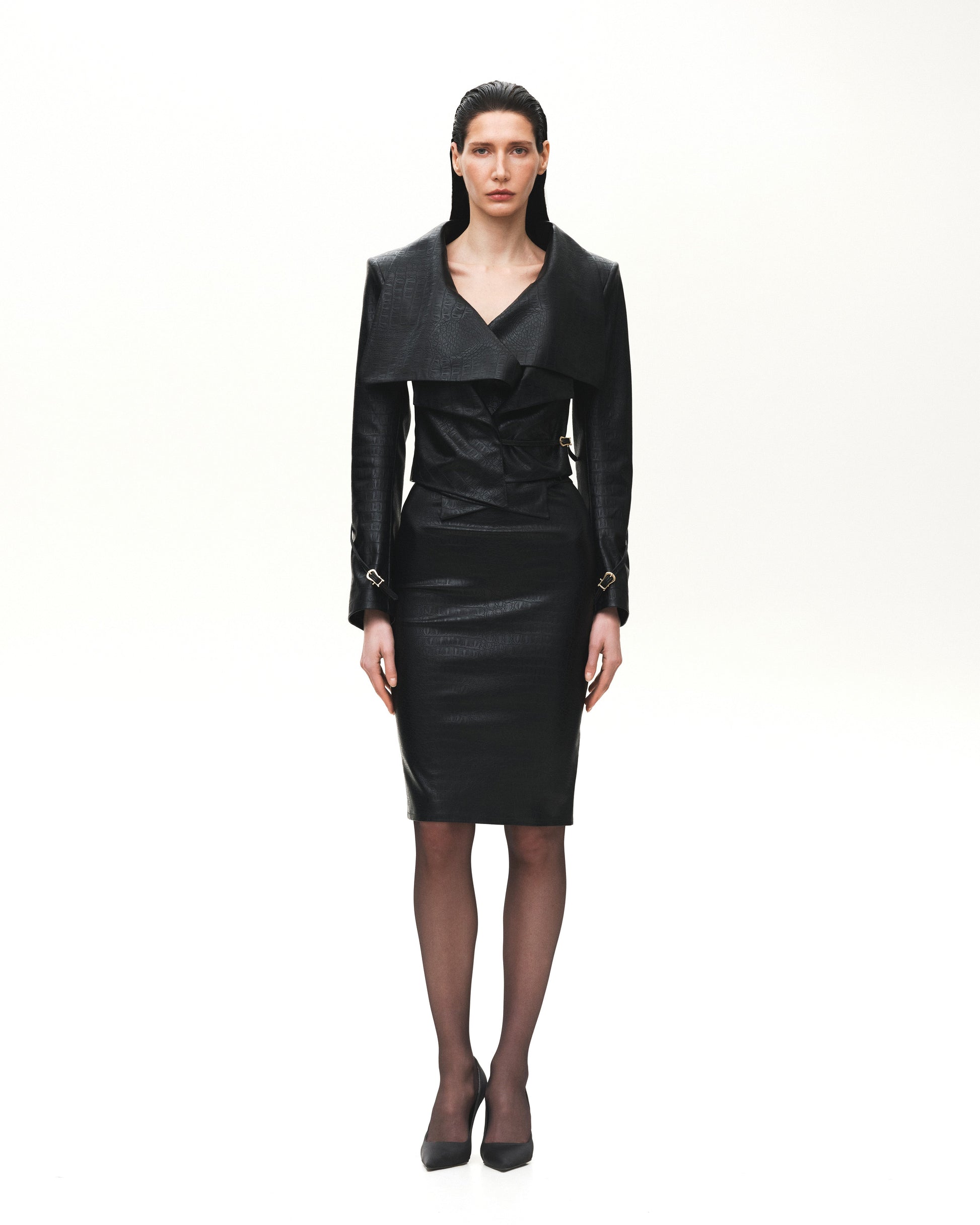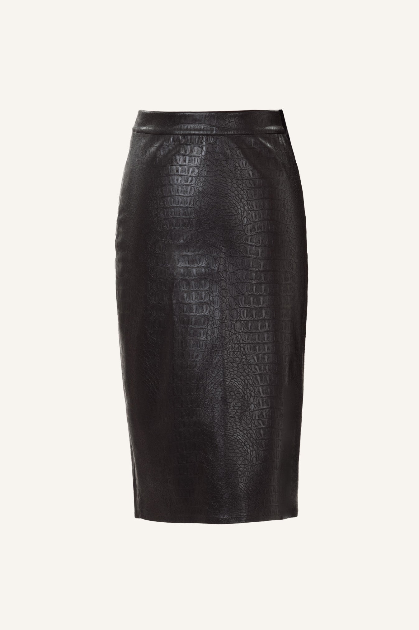 Спідниця з шкіри Vegan з тисненням Reptilia у довжині міді. Облягаючий силует, висока лінія талії.