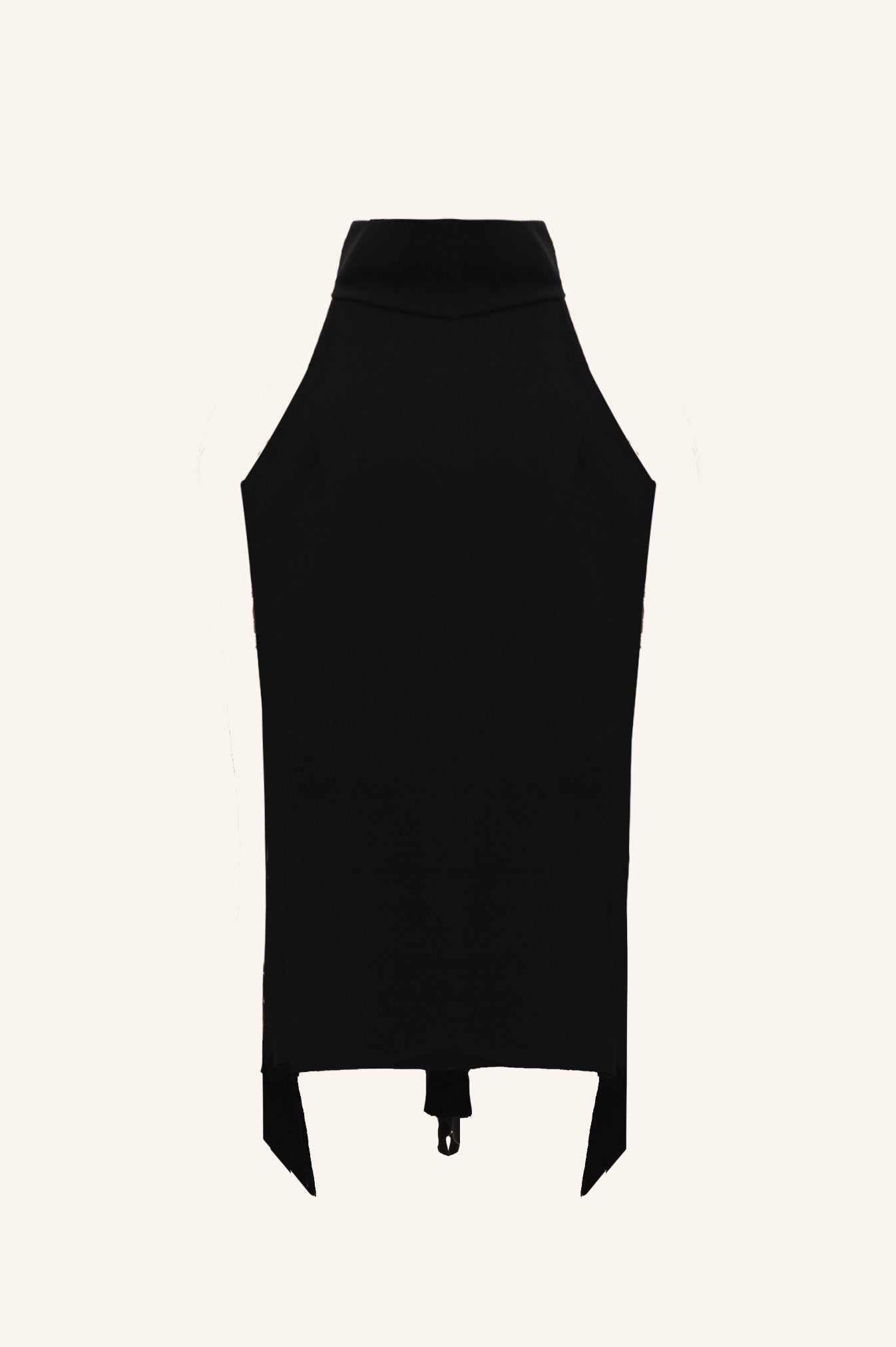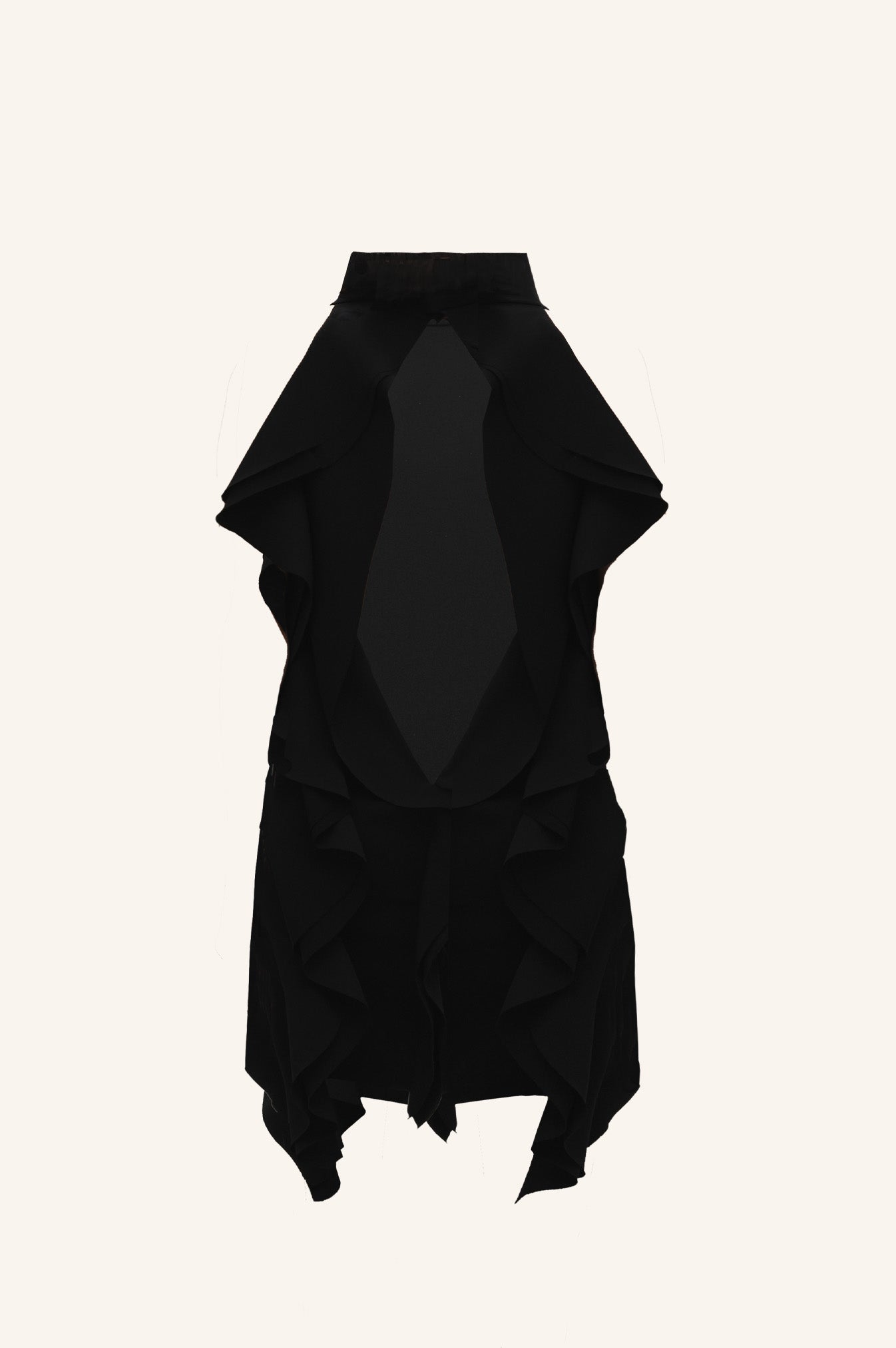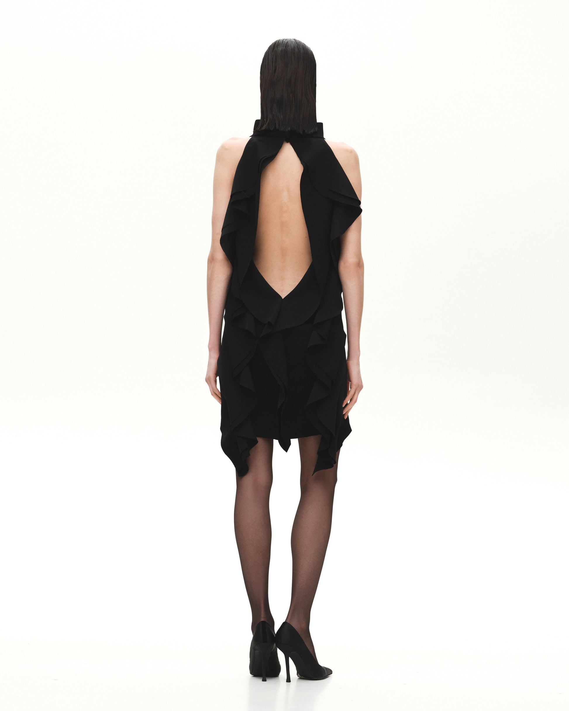 Чорна сукня у довжині міні з оголеною спиною, воланами та стійкою.