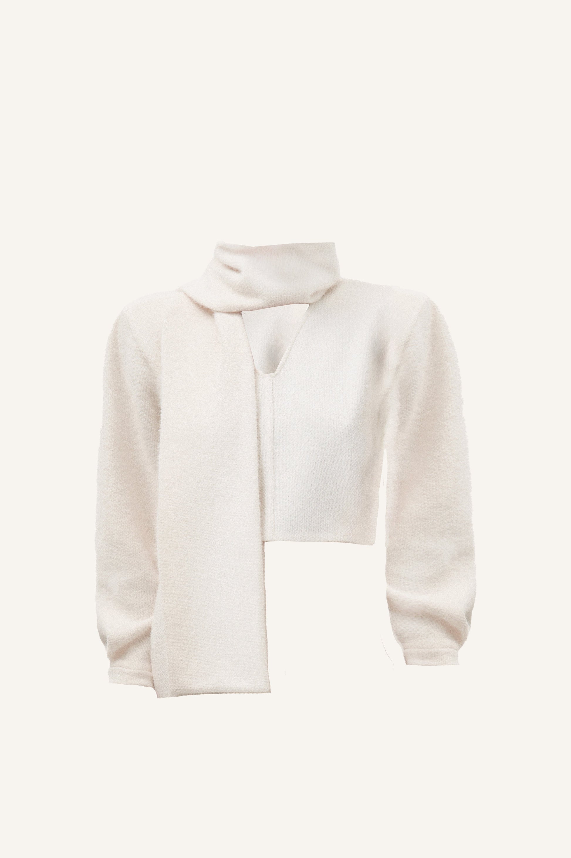 В'язаний білий светр з коміром-шаллю, який можна стилізувати як шарф, капюшон або відкидний комір.