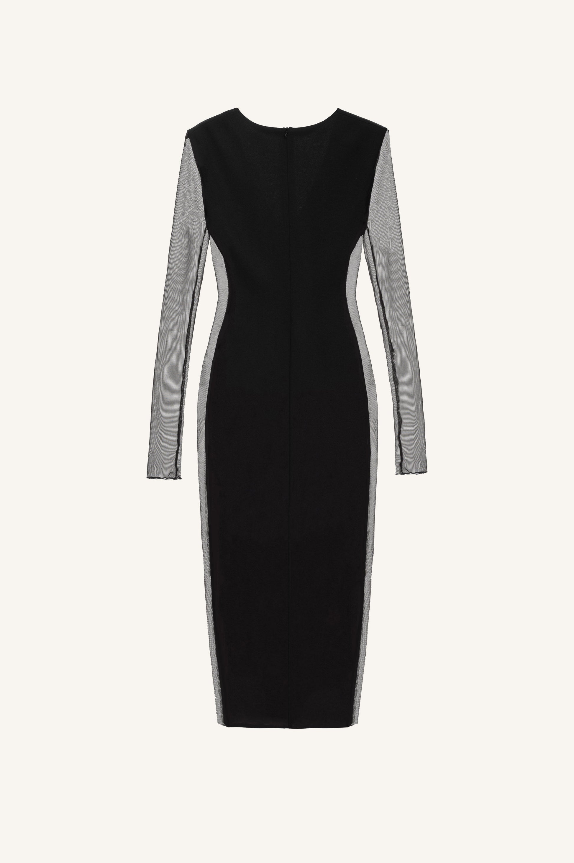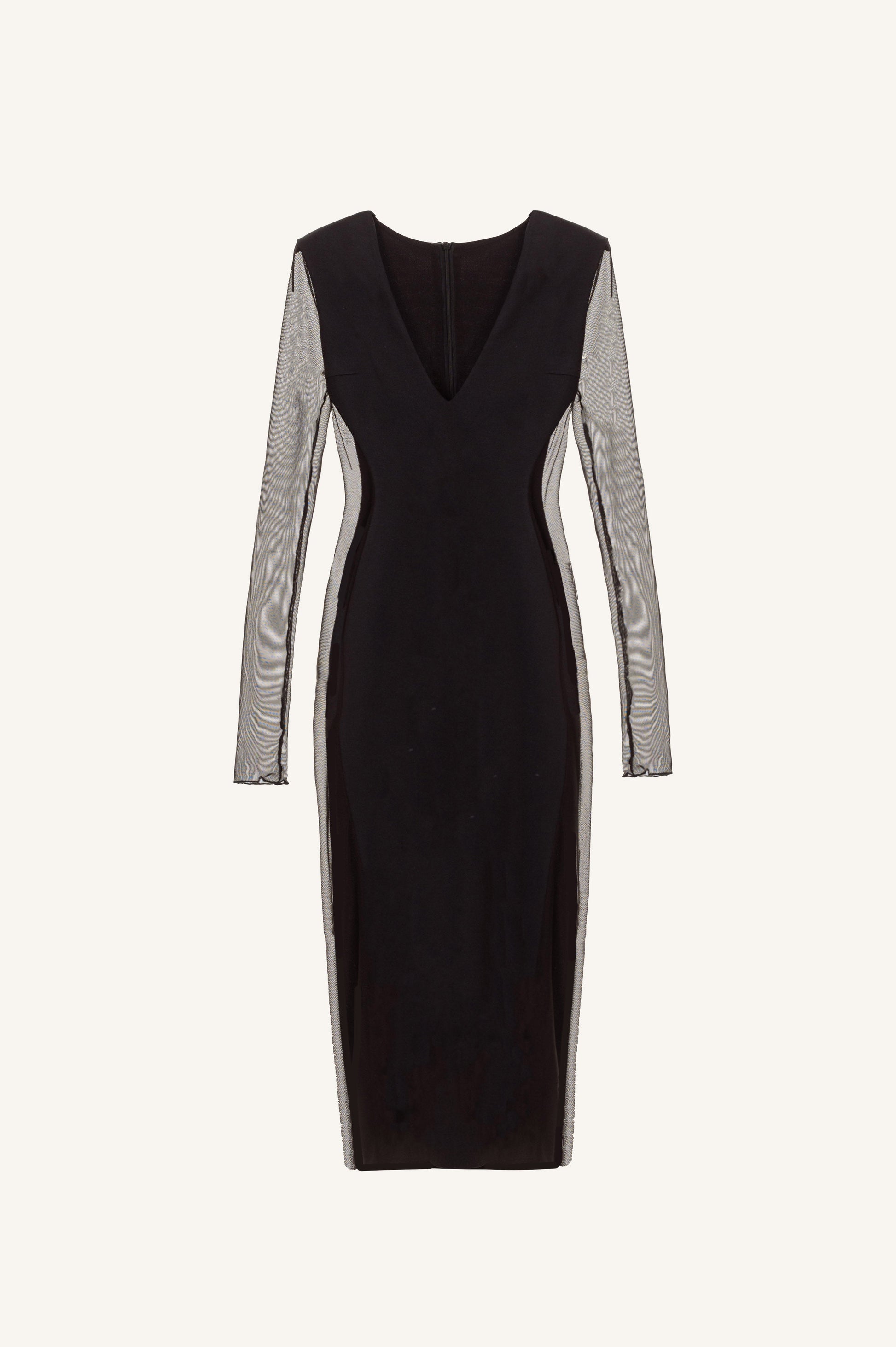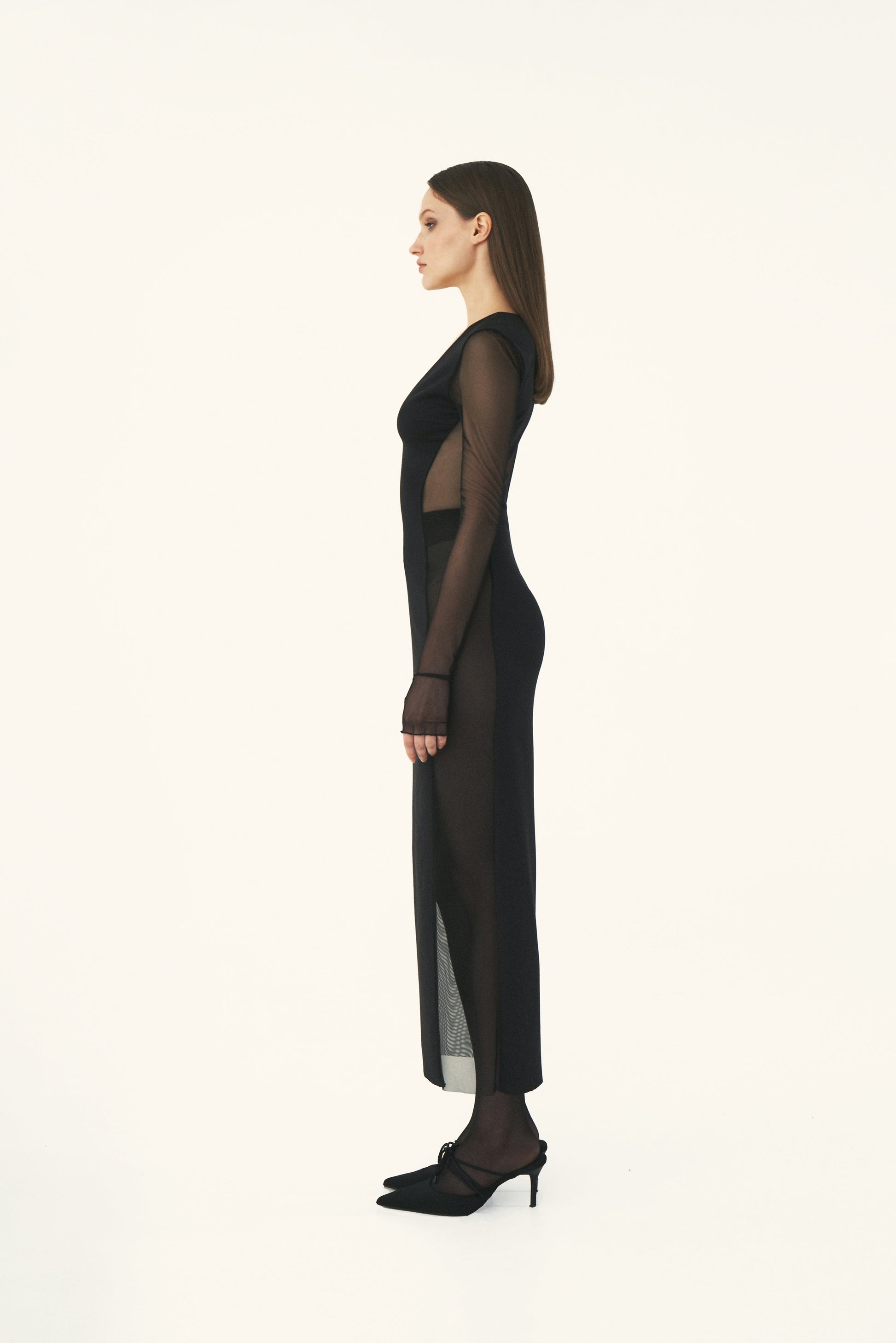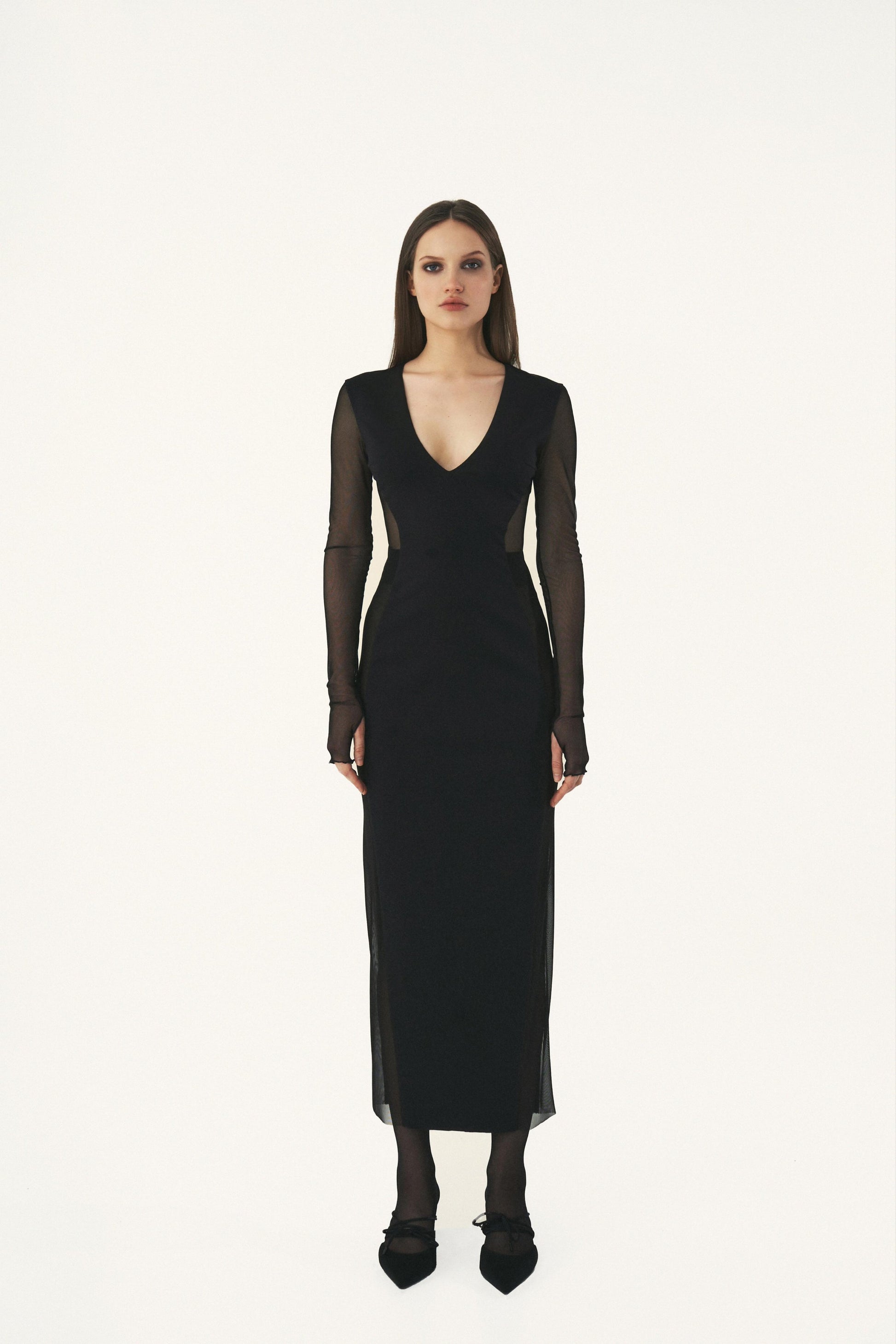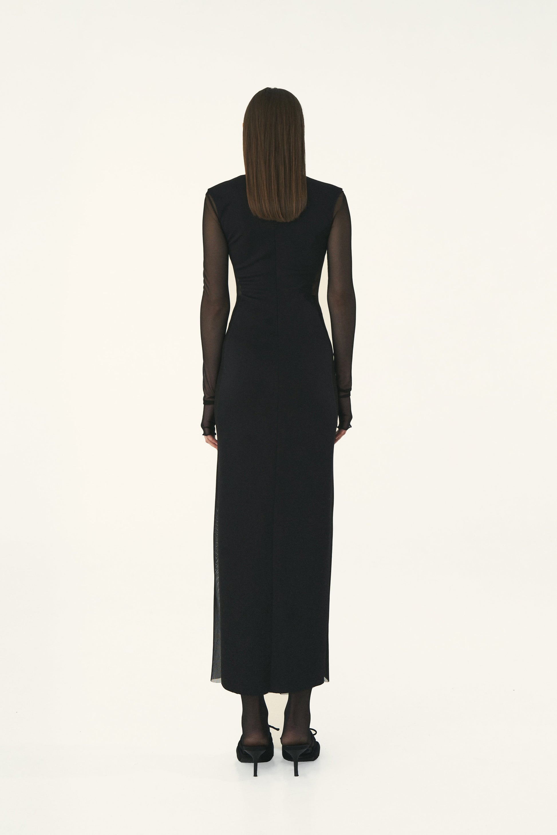 Силуетна сукня у довжині максі з прозорими боковими вставками та рукавами. Застібка на блискавці.