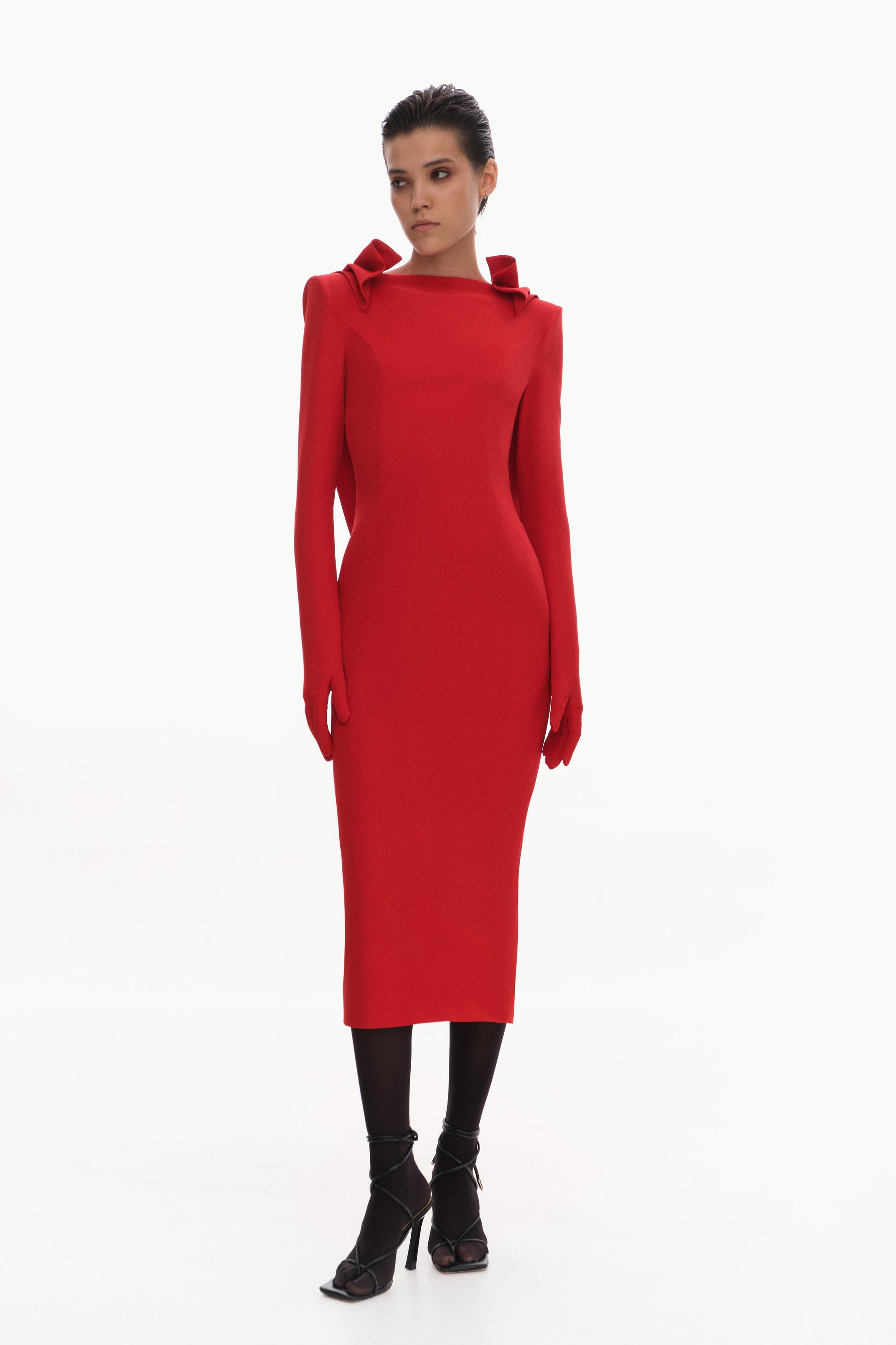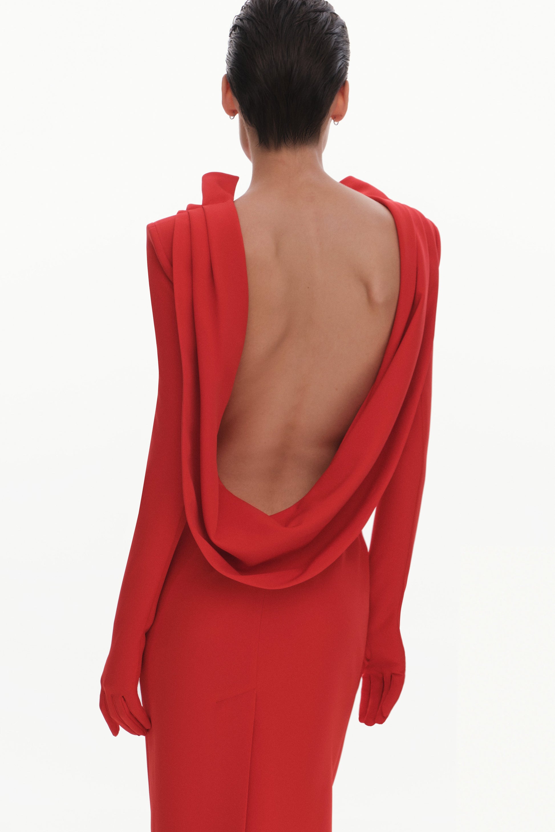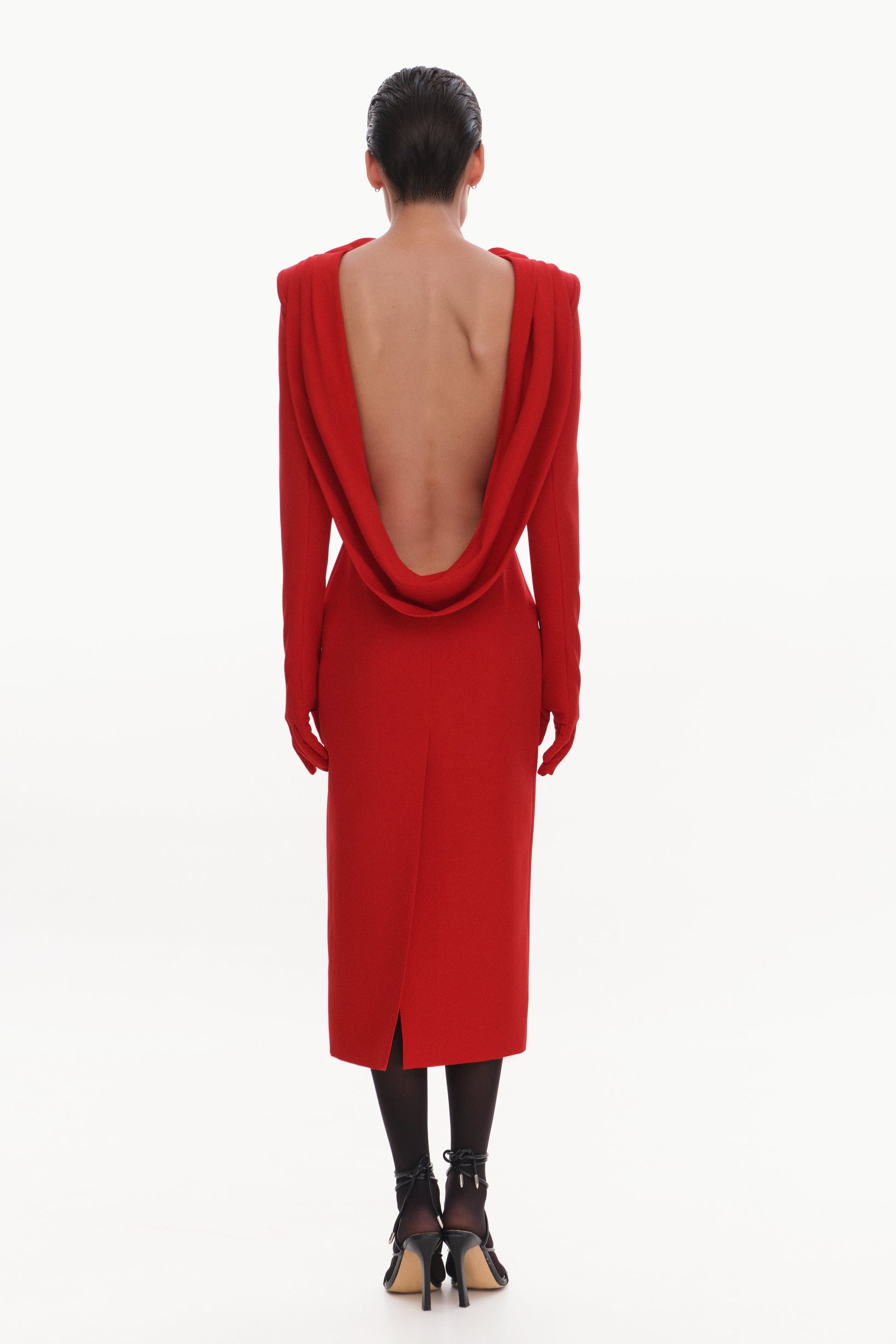 Облягаюча червона сукня з оголеною спиною у довжині міді, з рукавицями та глибоким хомутом по лінії спини.