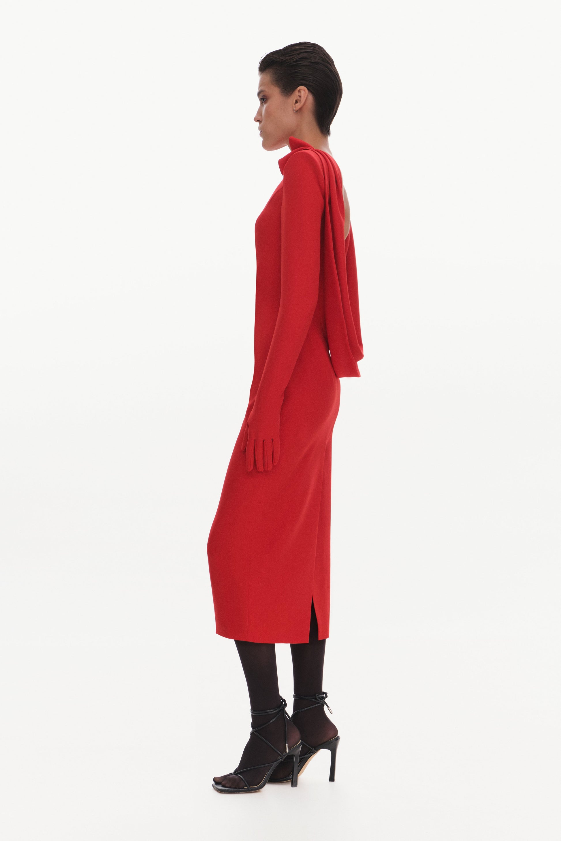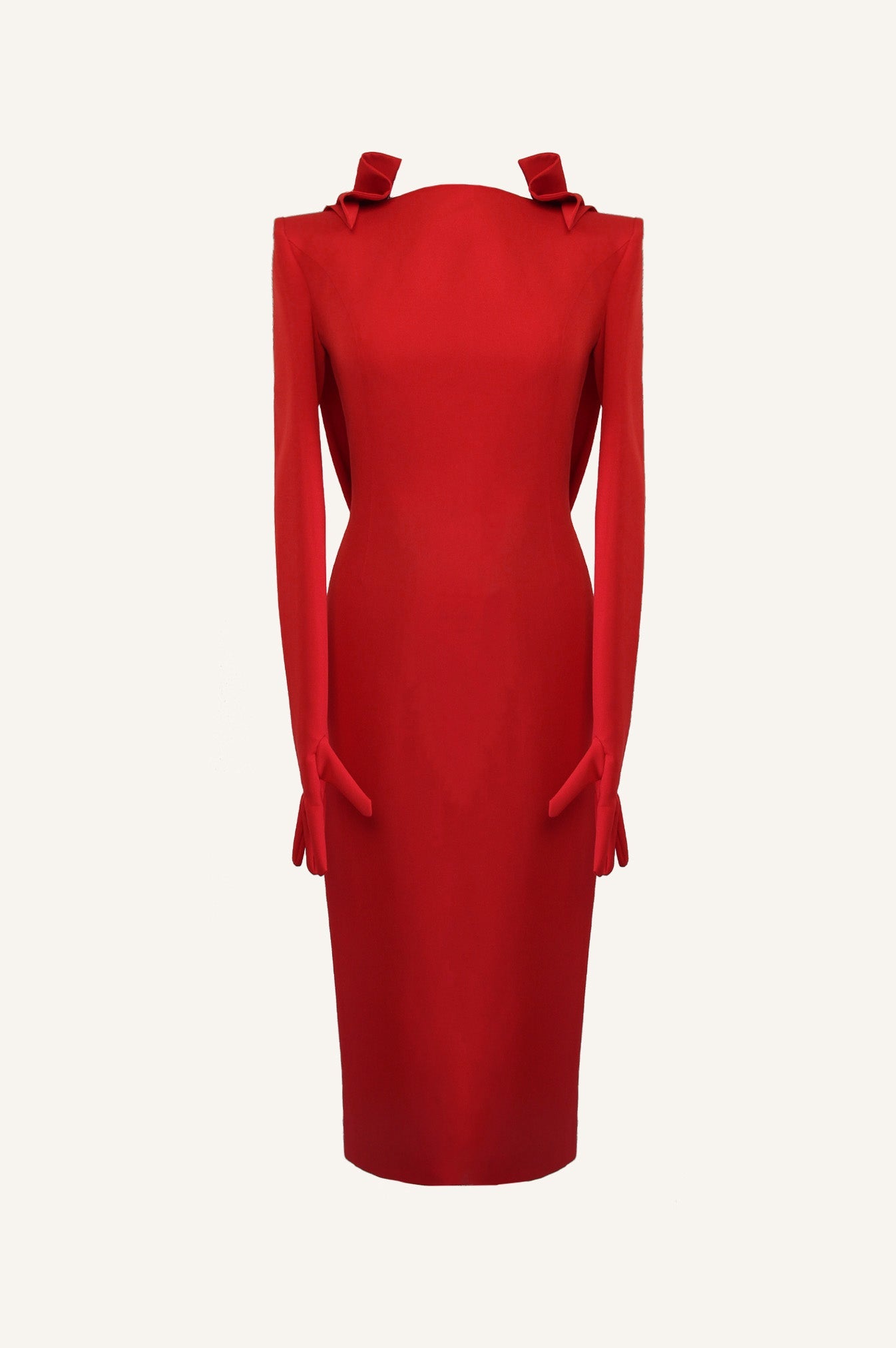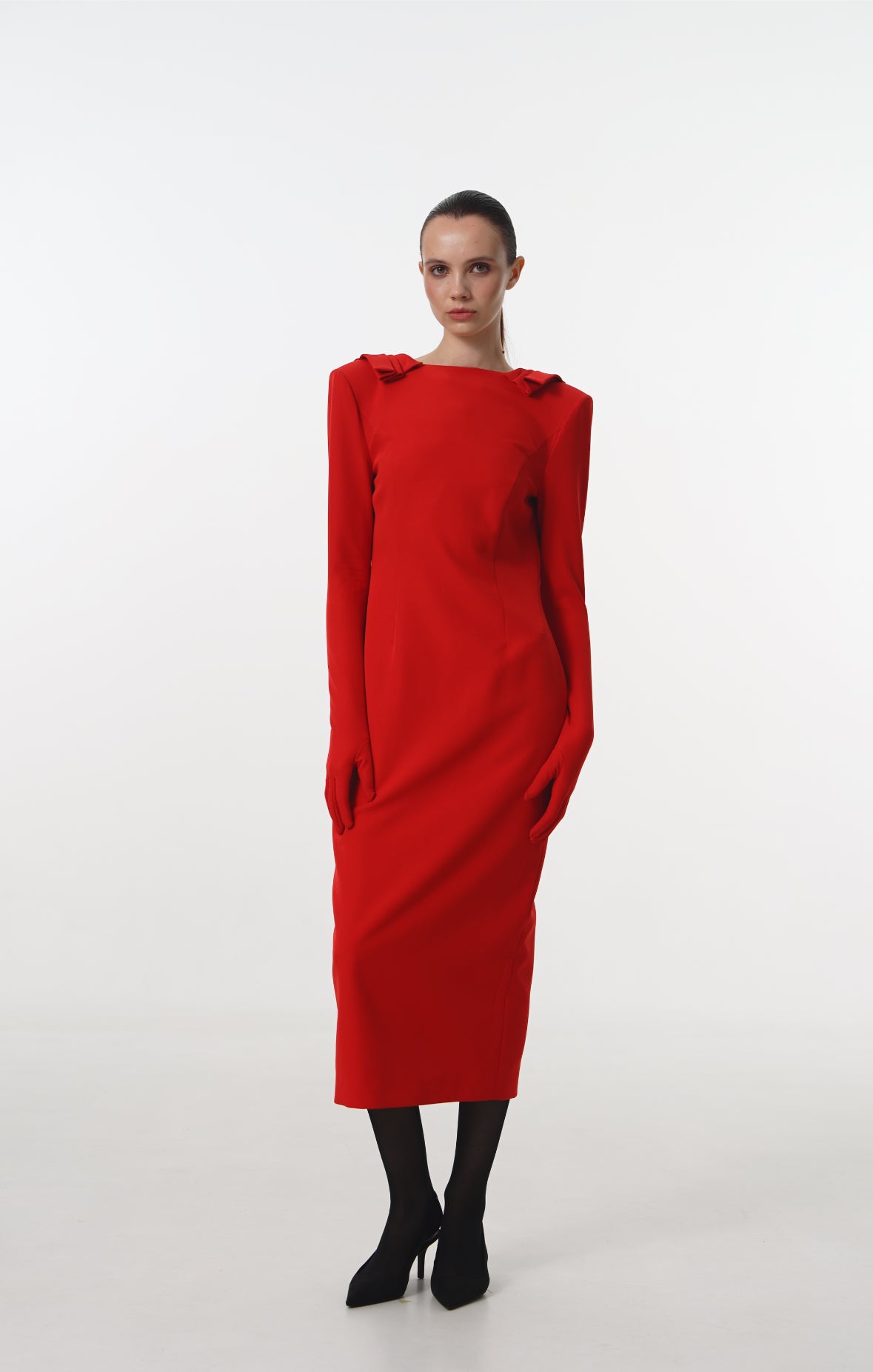 Облягаюча червона сукня з оголеною спиною у довжині міді, з рукавицями та глибоким хомутом по лінії спини.