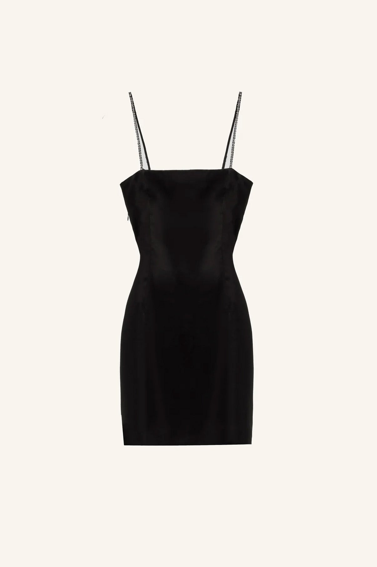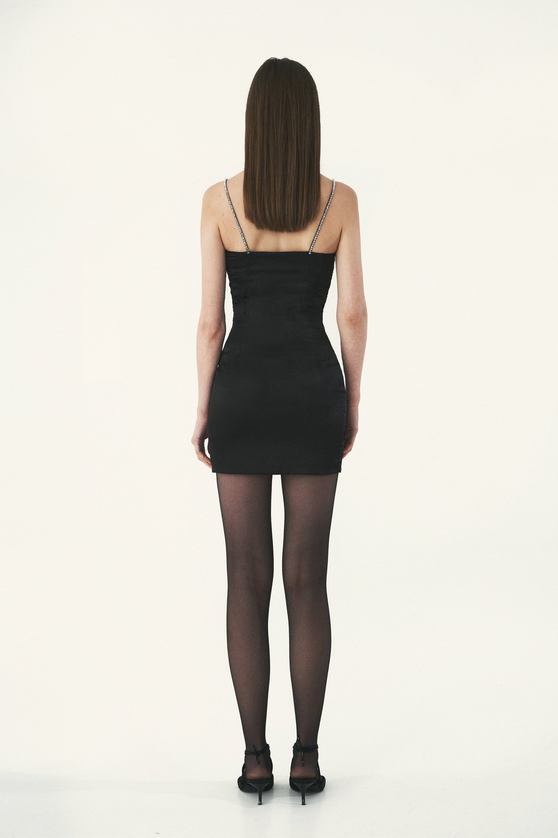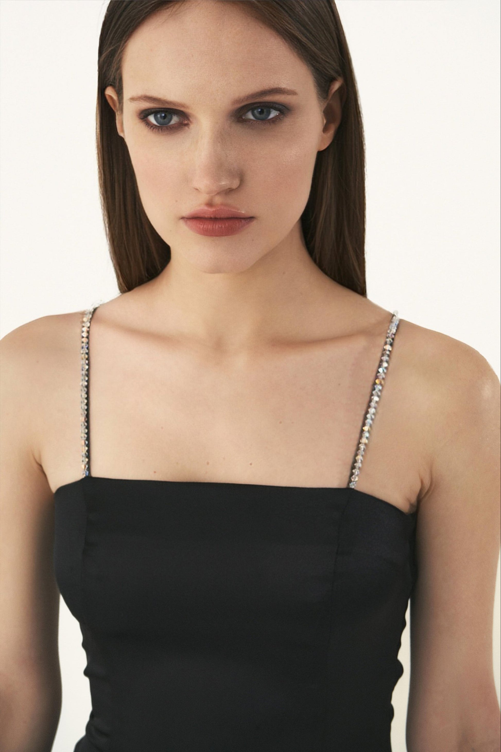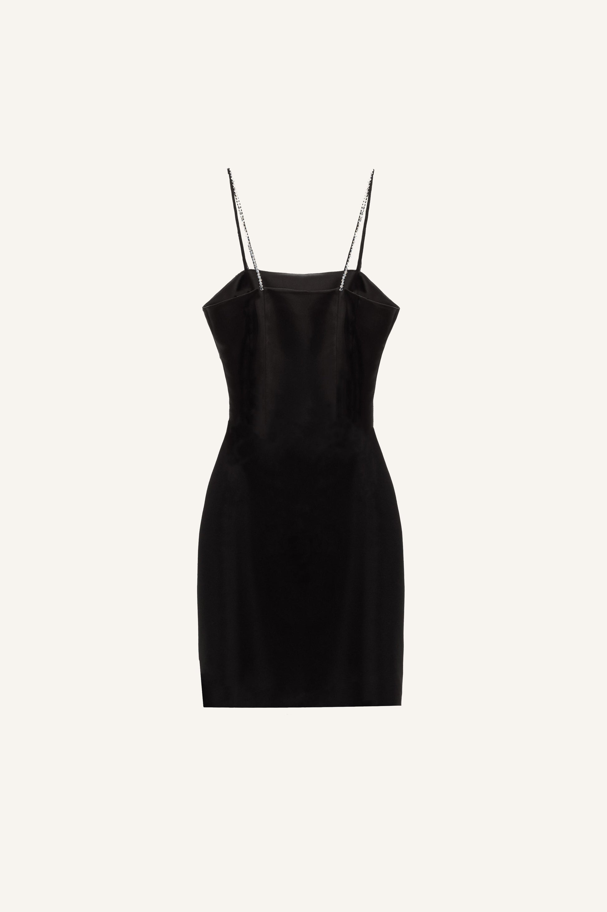 Облягаюча шовкова сукня на підкладці з кристалічними брительками та боковою застібкою на блискавці.