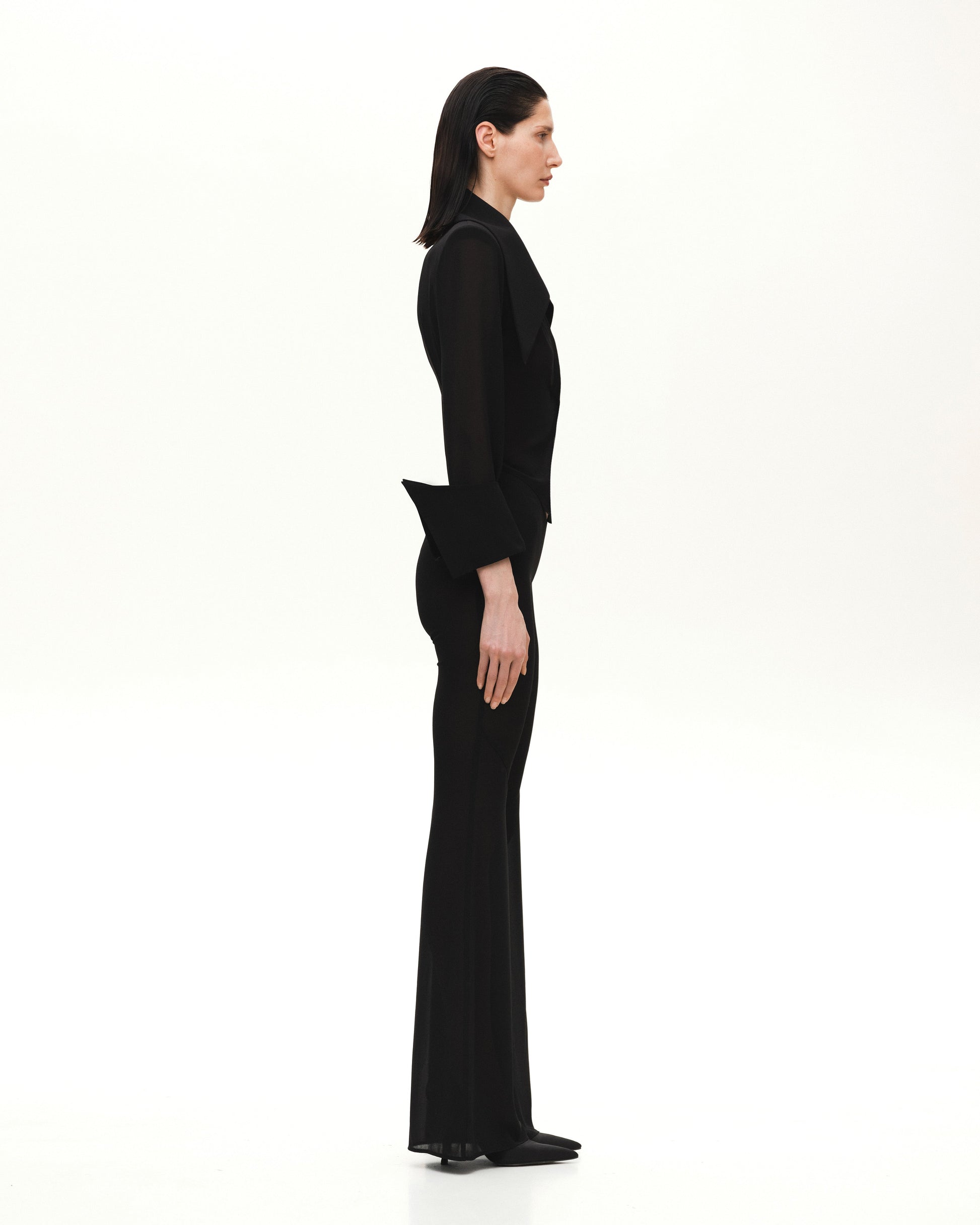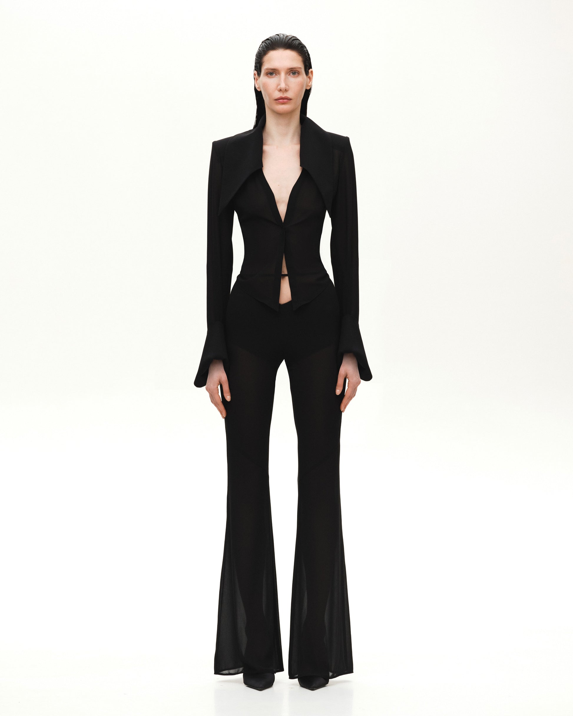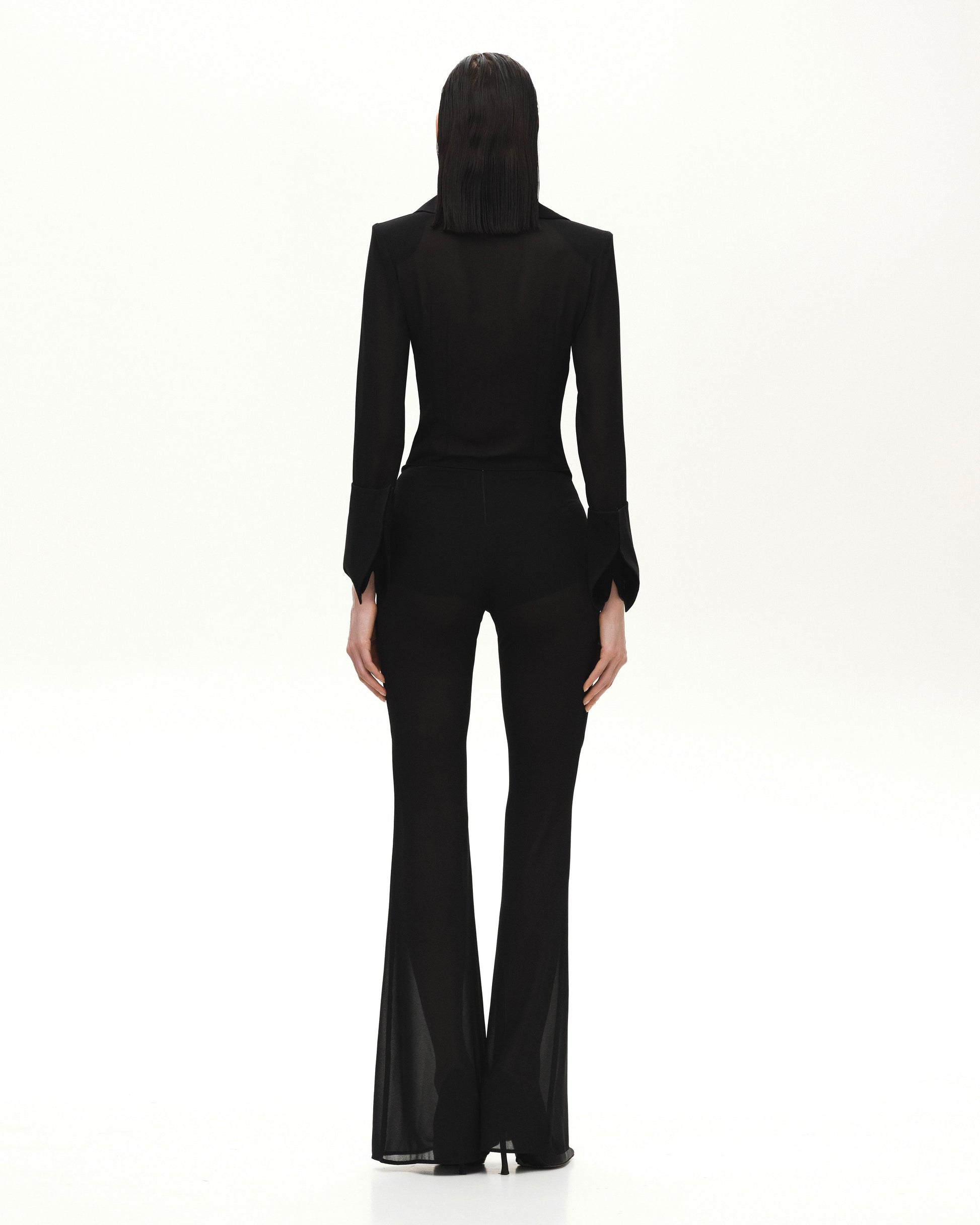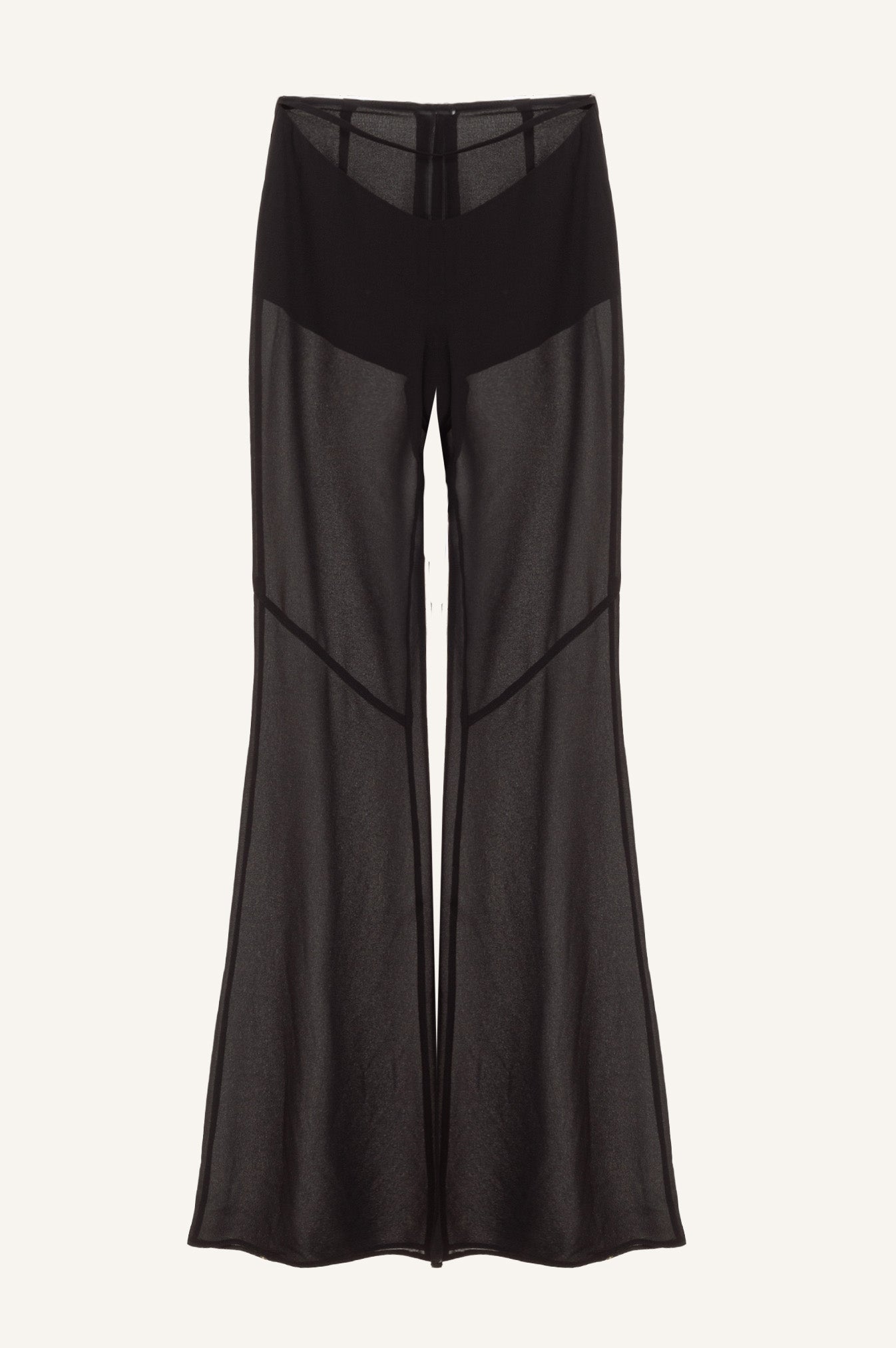 Чорні прозорі штани кльош з вирізом на передній частині та декоративним пояском, шортиками та прихованою застібкою на блискавці.