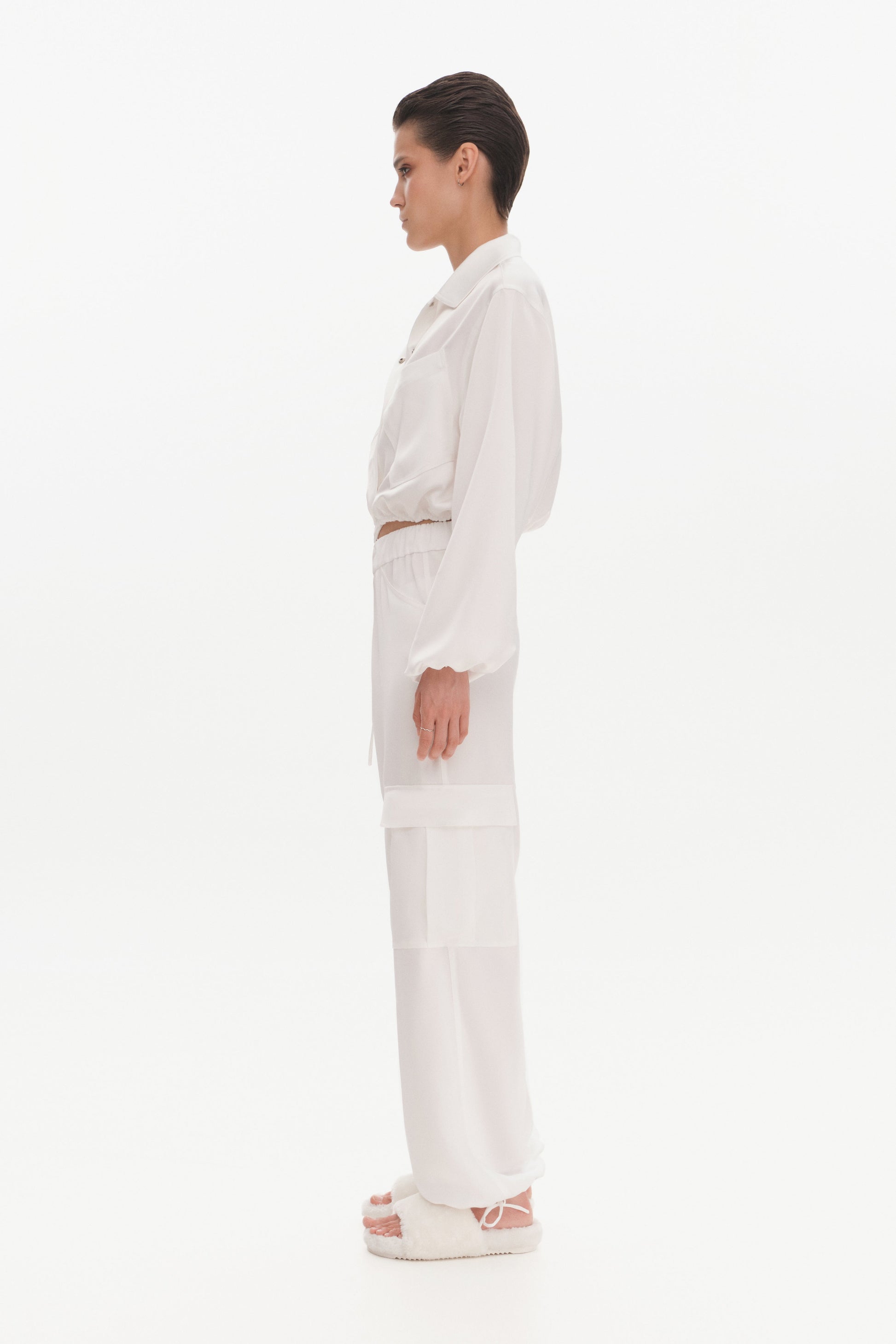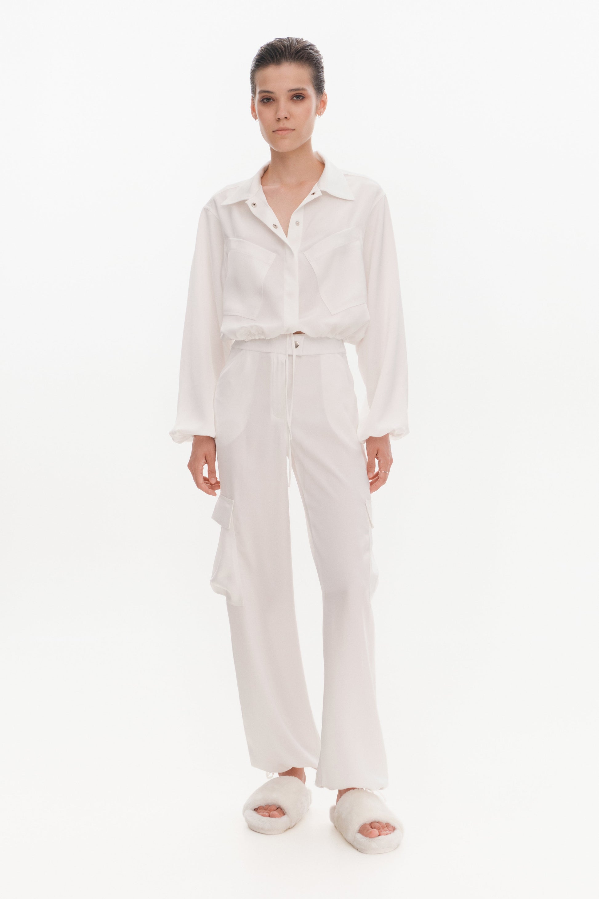 Шовкові штани карго з накладними кишенями у стилі мілітарі по довжині брюк та двома задніми кишенями, фронтальною застібкою на блискавці та металевій кнопці. Ширина пояса та нижньої частини штанів регулюється.