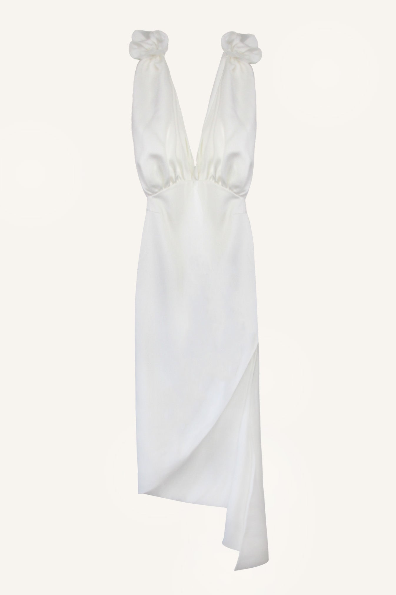 Сукня з драпіруванням та асиметричним шлейфом. Прикрашена аплікаціями з двох троянд ручної роботи. Глибокий V-подібний виріз спереду і ззаду. Підкладка.
