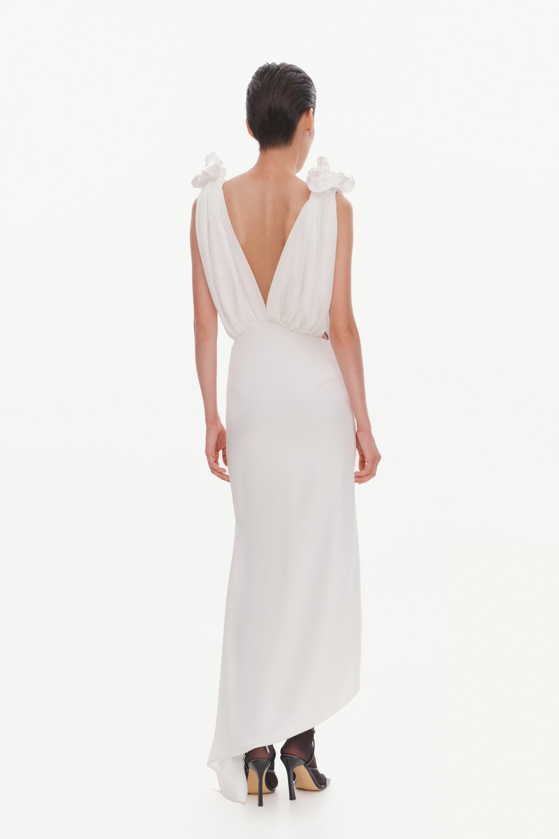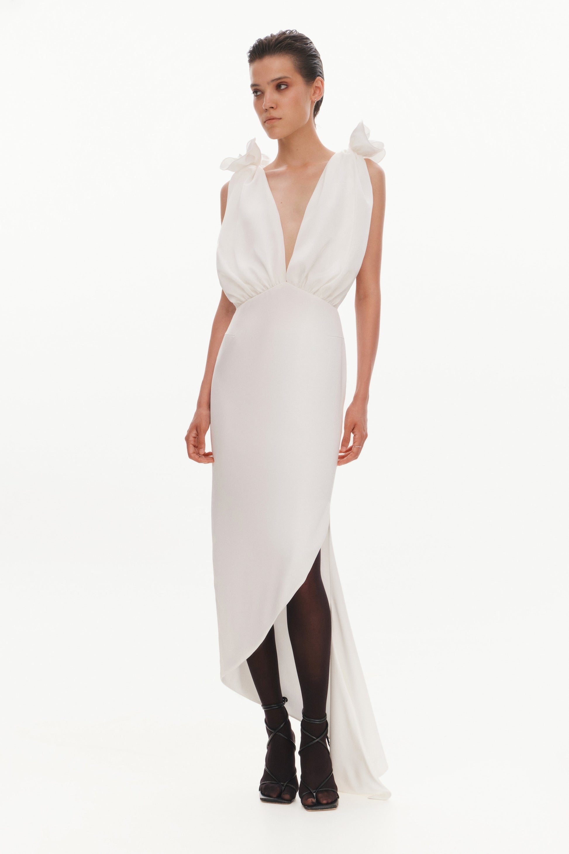 ЗАКВІТЧАНА СУКНЯ З ДРАПІРУВАННЯМ ТА АСИМЕТРИЧНИМ ШЛЕЙФОМ