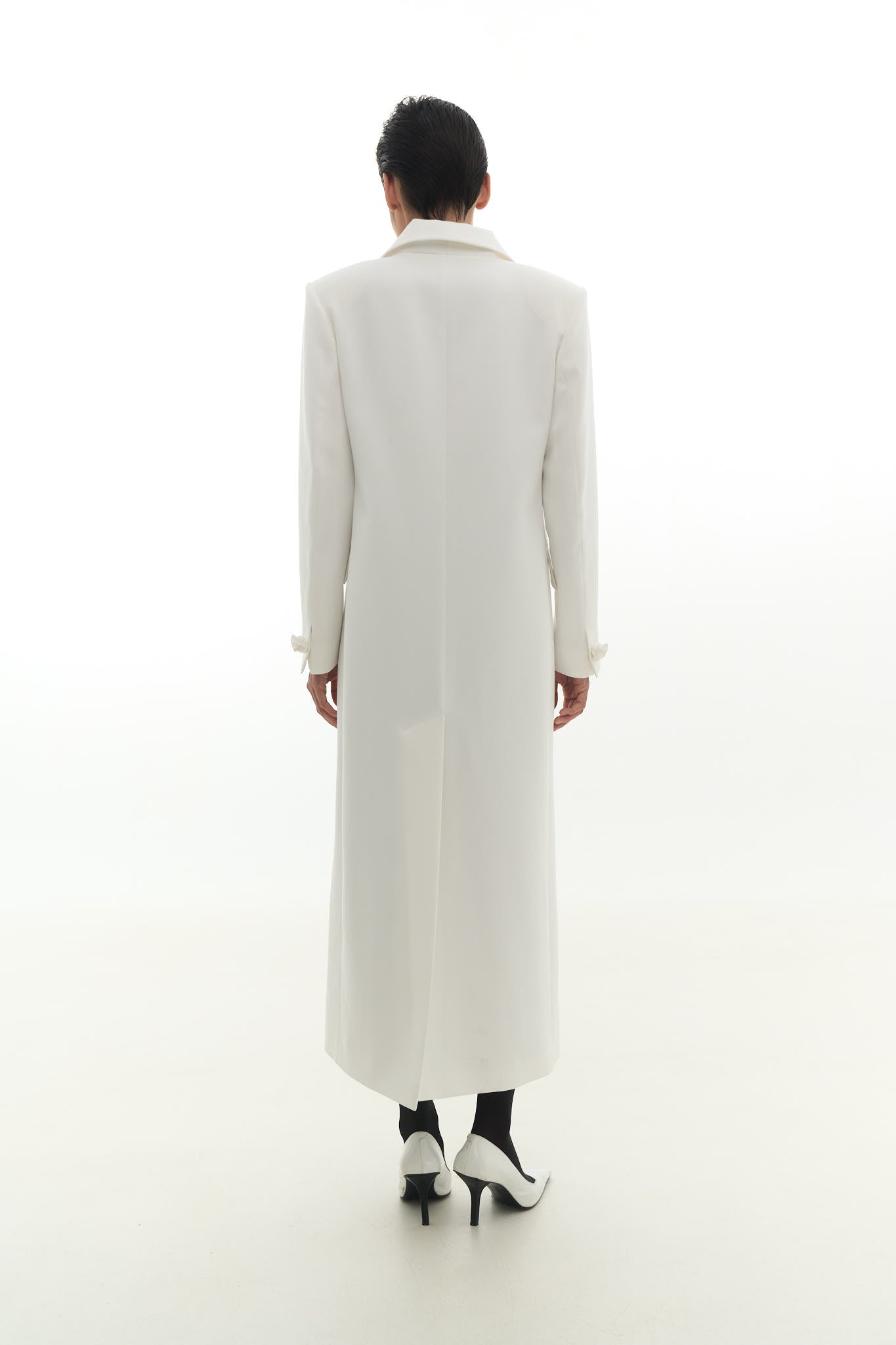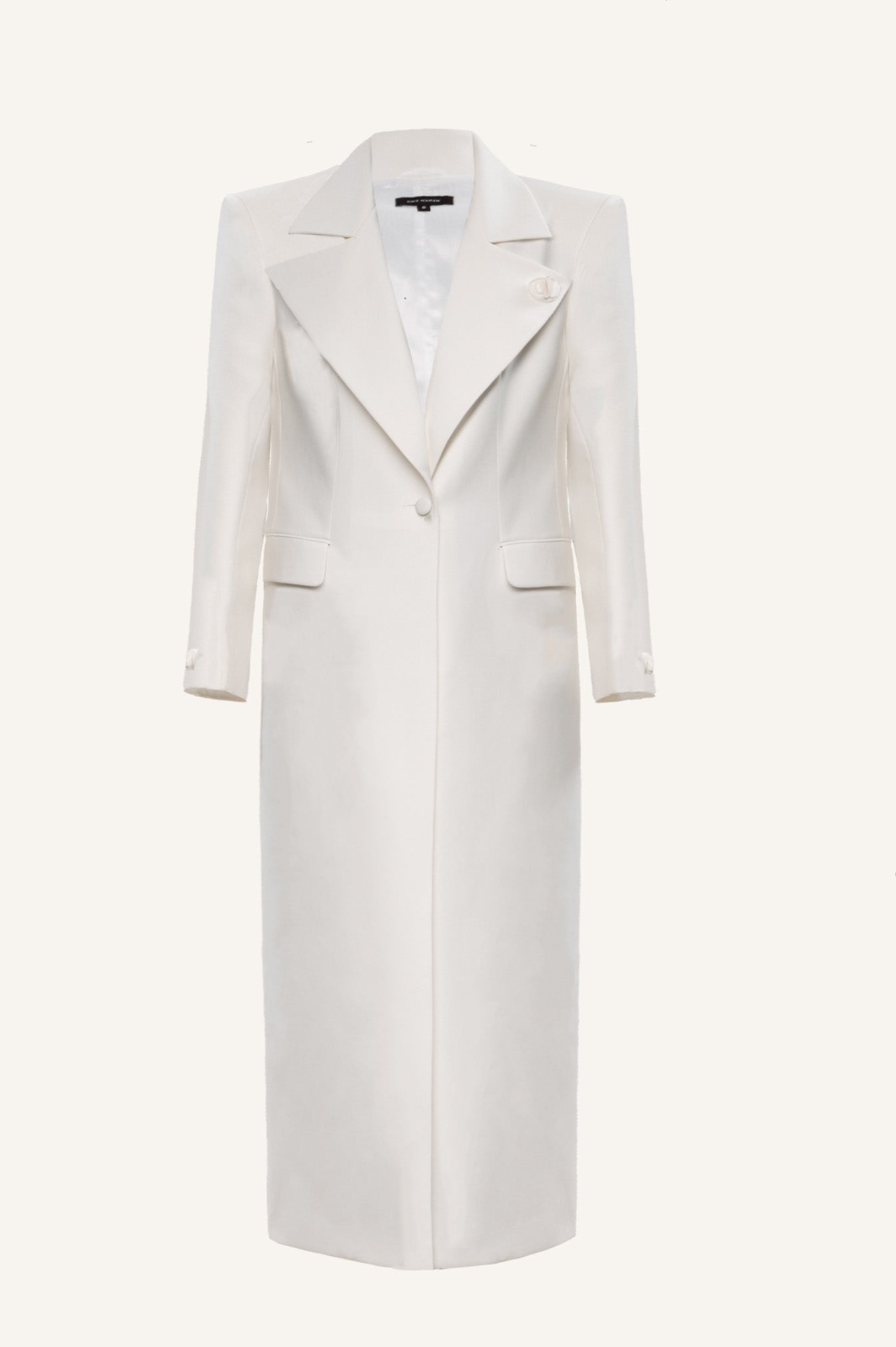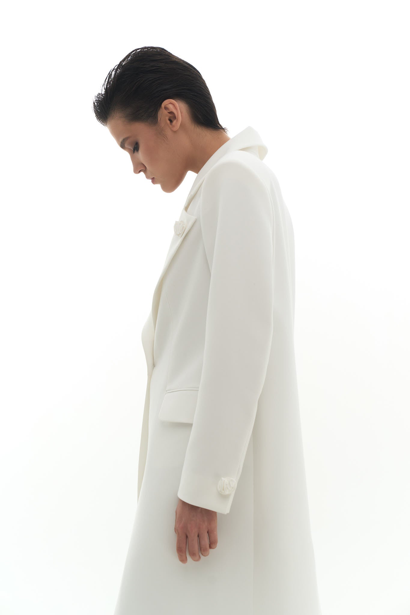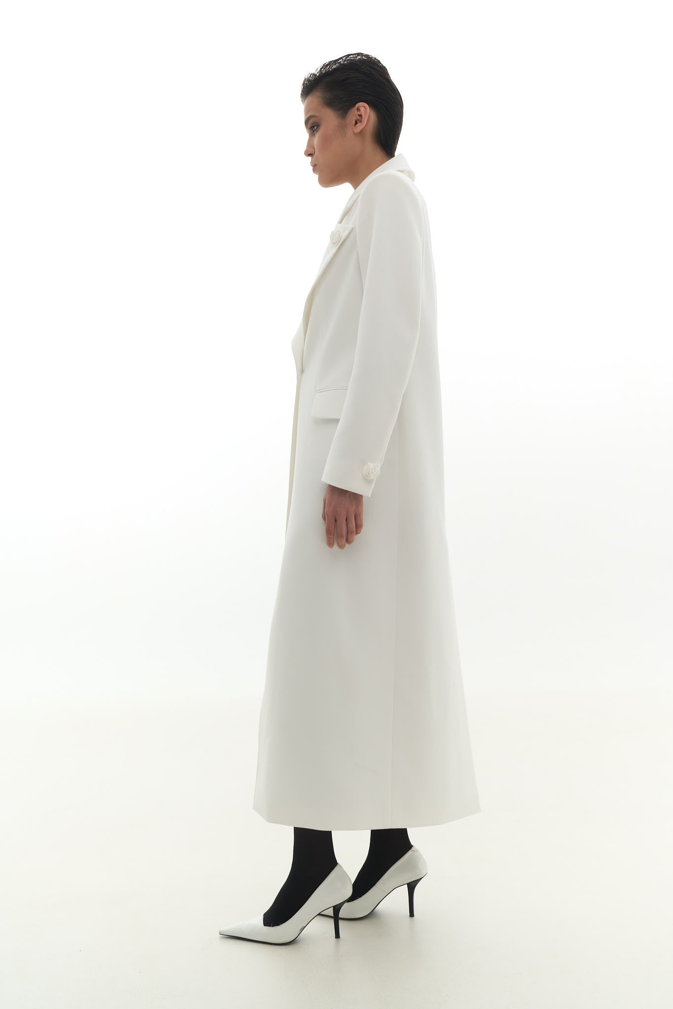 Пальто прямого силуету з розширеним плечем у довжині максі. Декороване аплікаціями з троянд на комірі та рукавах. Застібка на один гудзик. Бокові кишені-клапани.
