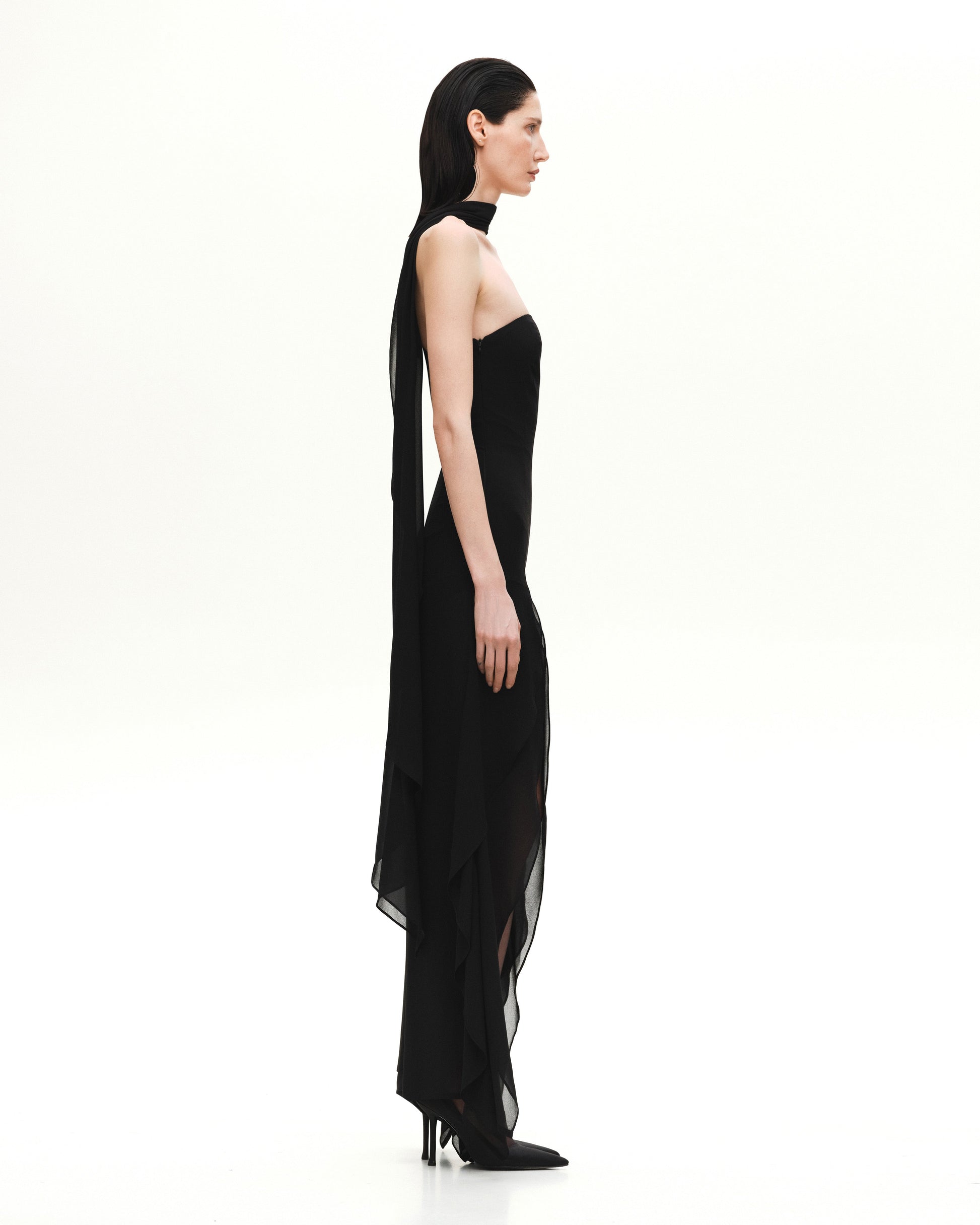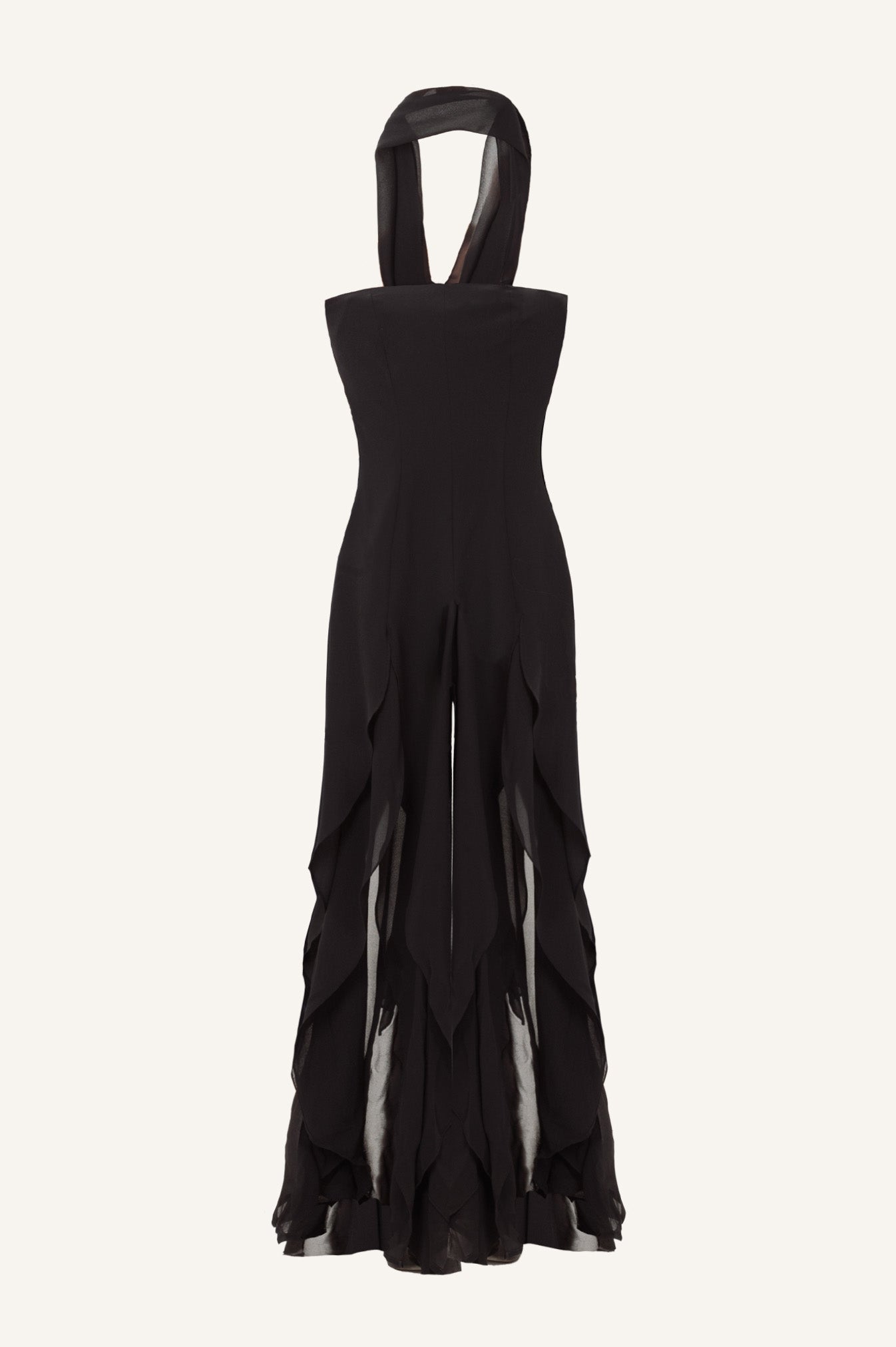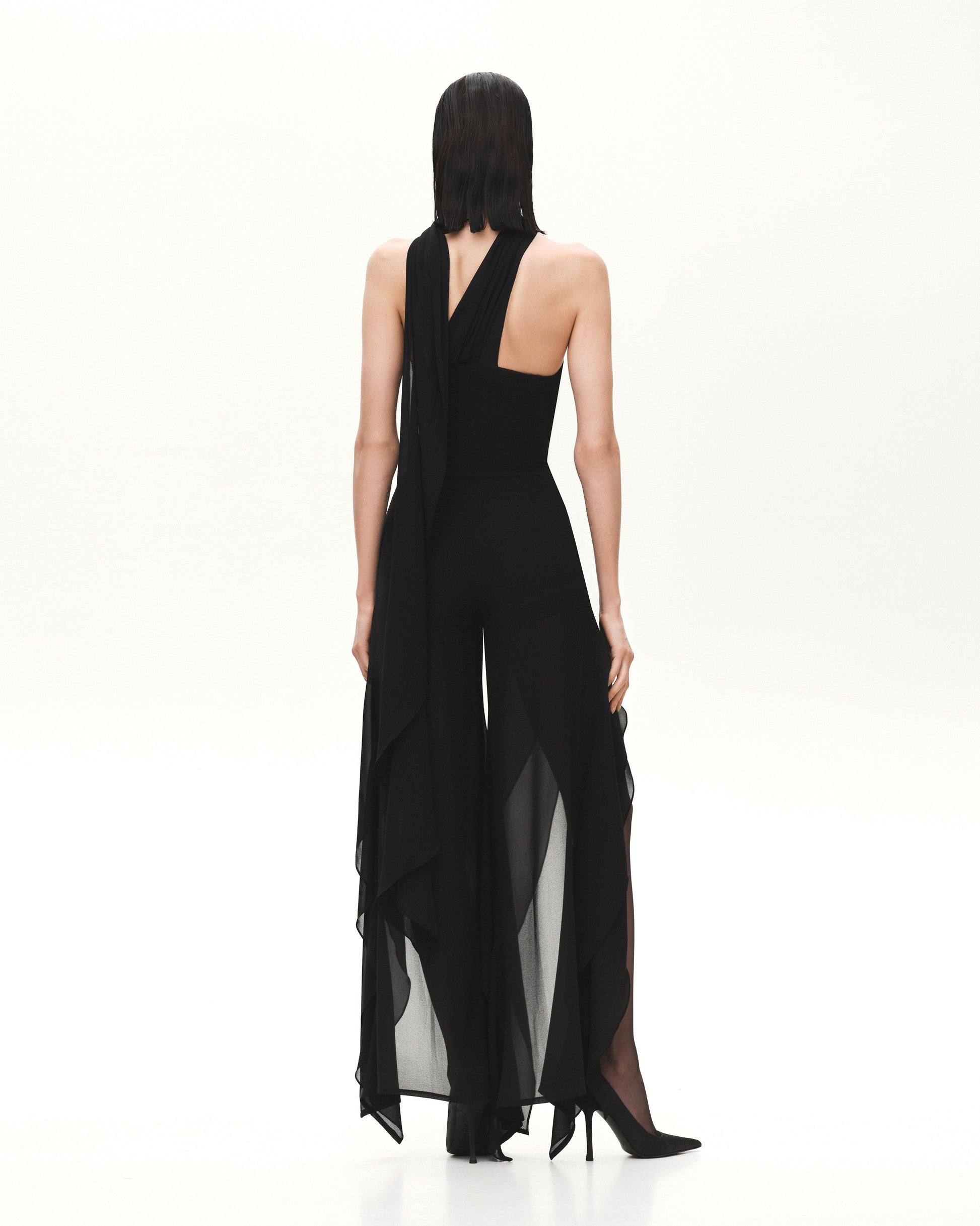 Чорний комбінезон з прозорими штанами, глибокими розрізами, шаллю та оголеними плечима.