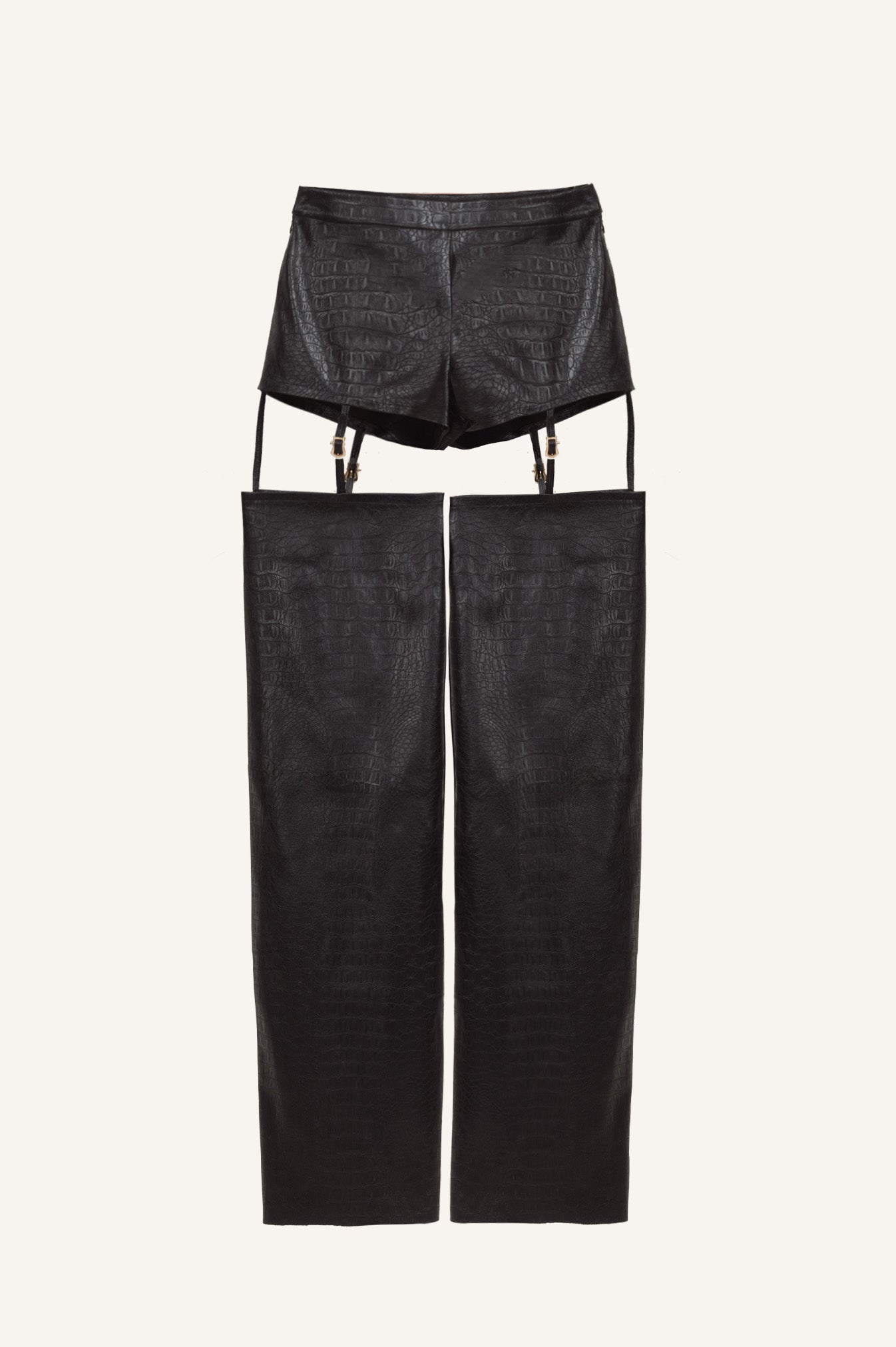 Штани-трансформери з шкіри Vegan з тисненням Reptilia, декоративними елементами-підтяжками та золотими пряжками. Прямий силует, висока лінія талії. Нижня частина штанів від'єднується за допомогою пряжок.