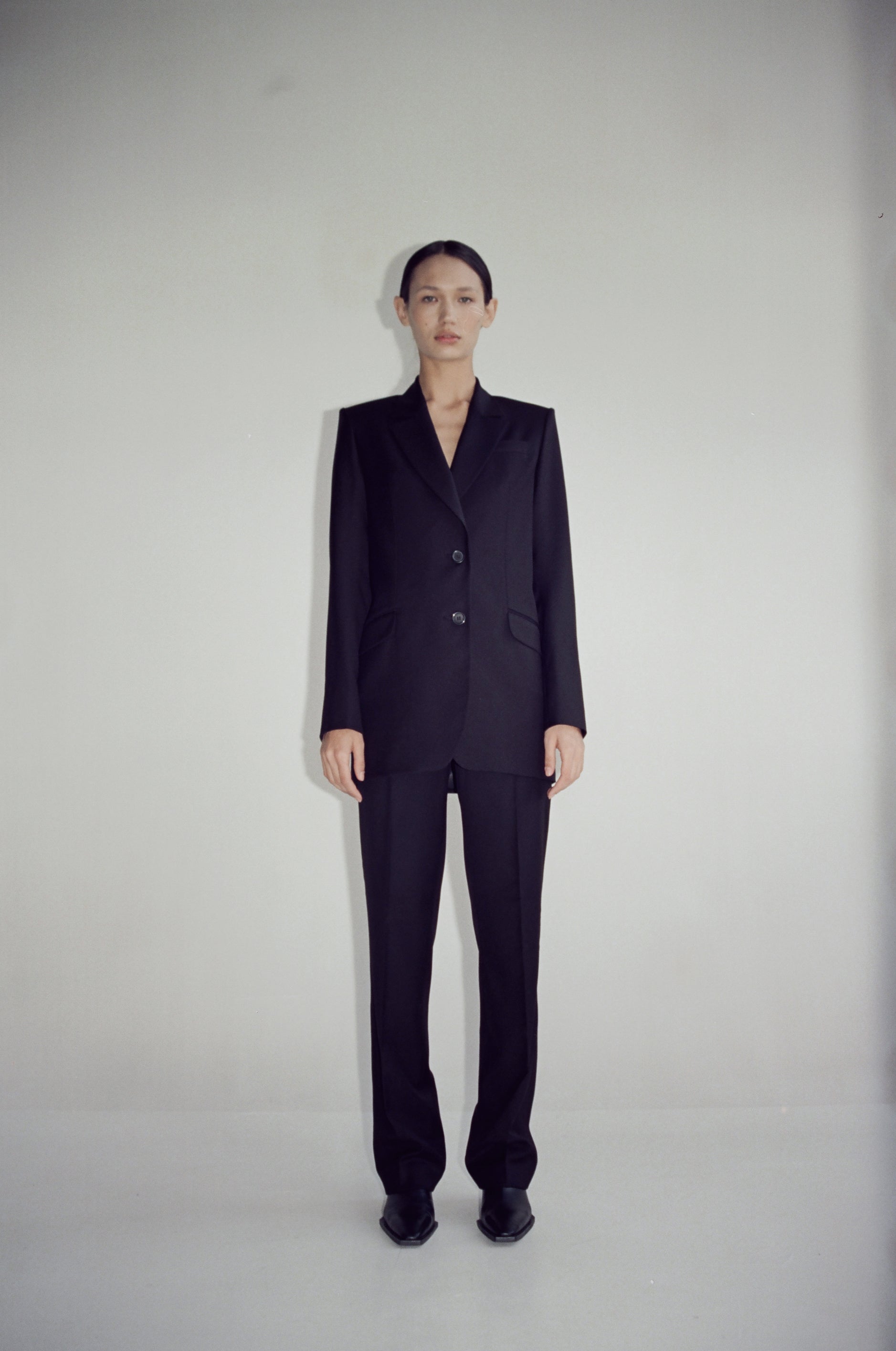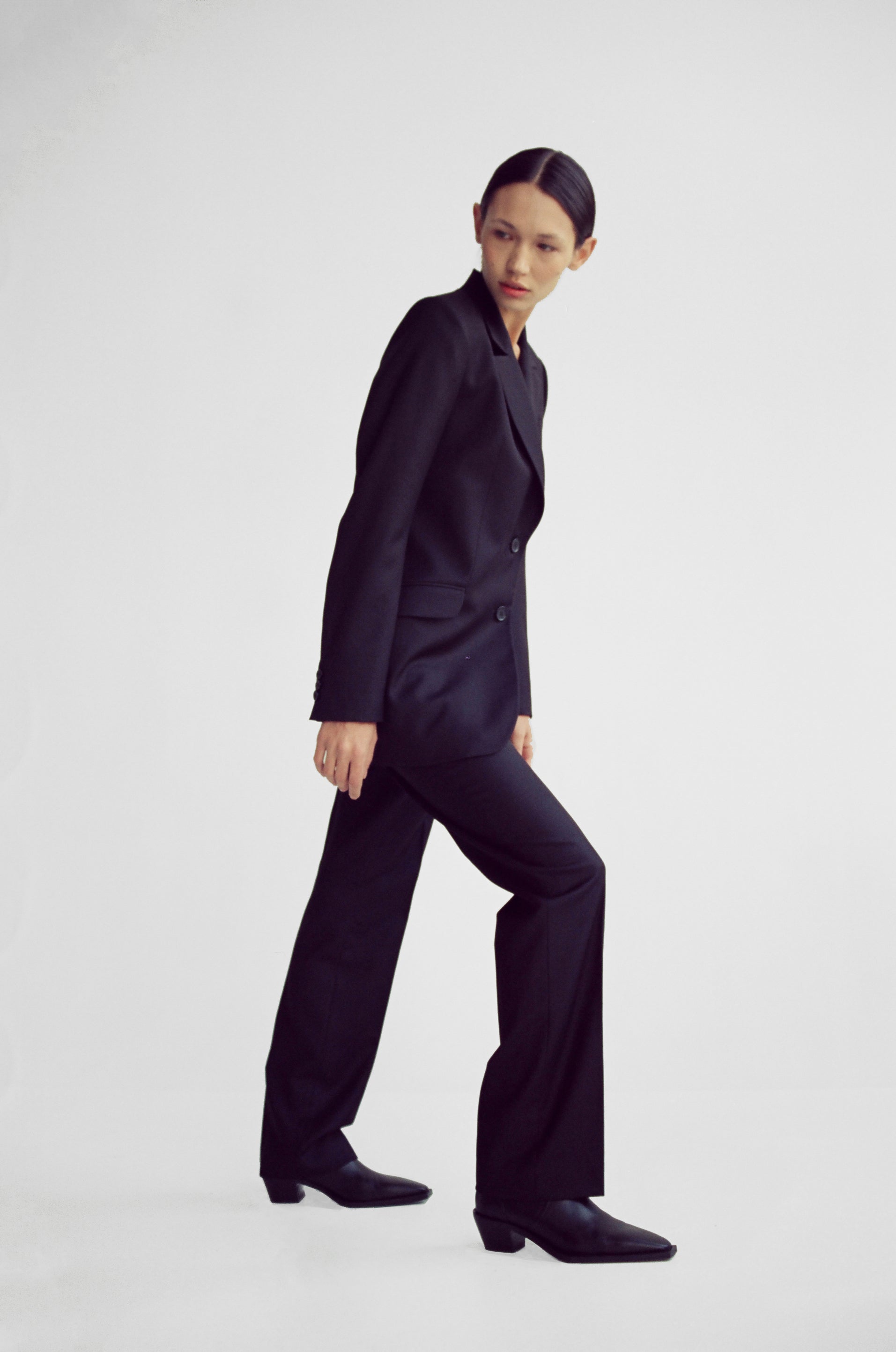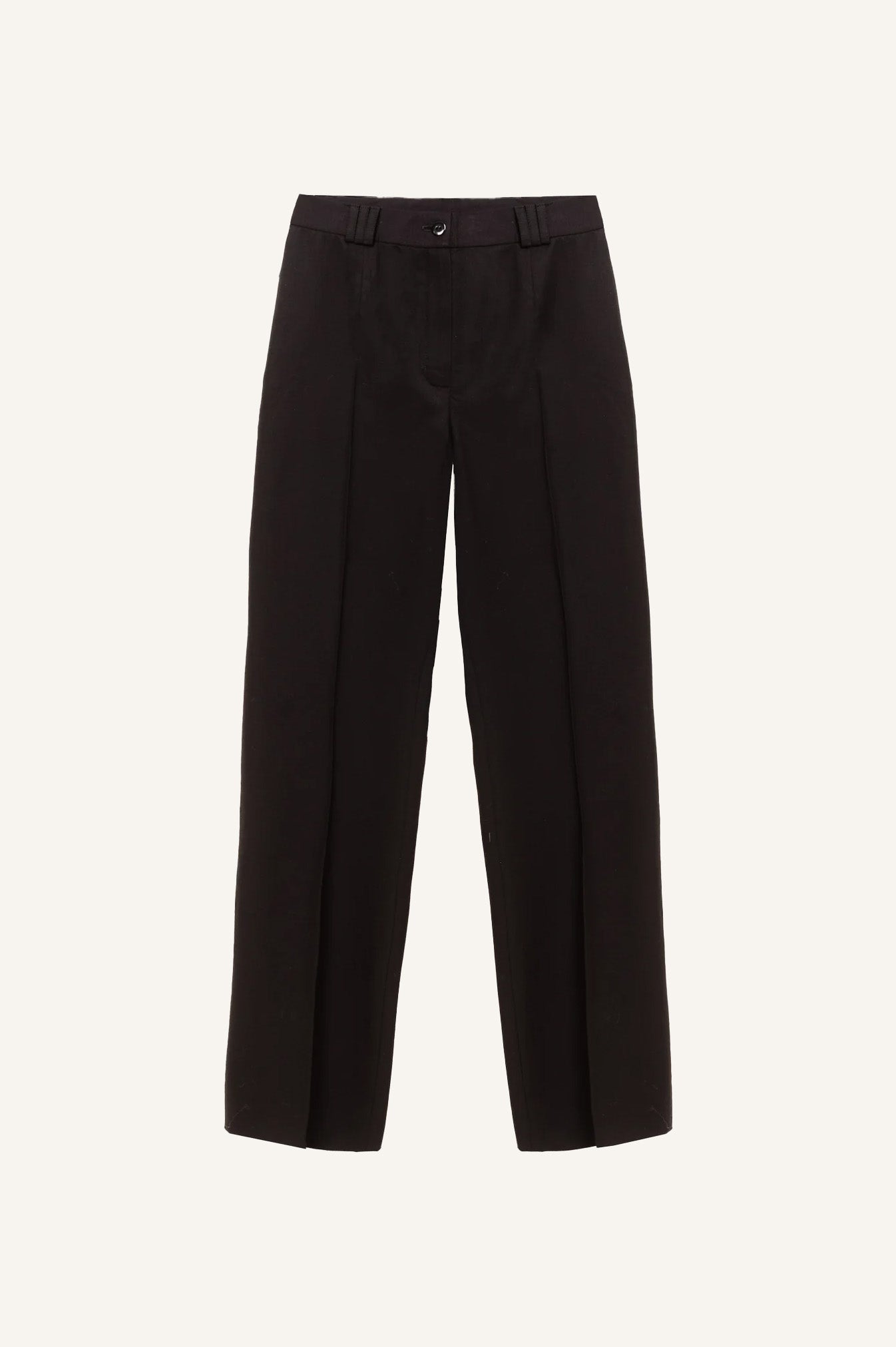 Прямі штани з костюмної шерсті, високою талією, кишенями, застібкою на блискавці та ґудзику на лінії талії.